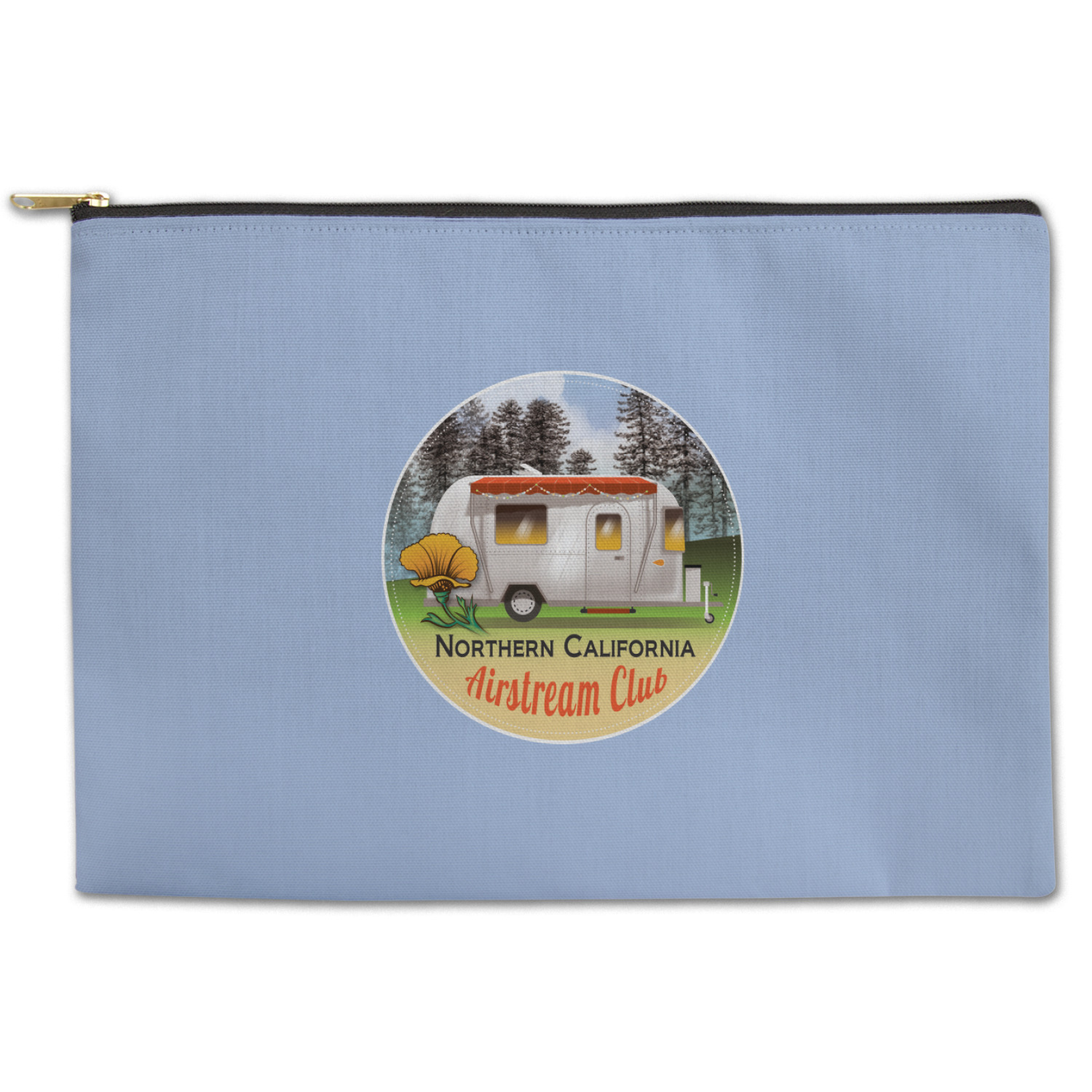 Our zippered pouches are available in two sizes - small: approx 8.5W"x6H and large: approx 12.5Wx8.5H. The pouches are made from a soft & durable canvas fabric that is printed on the outside with your design; the inside has a fused black lining. The printed canvas fabric is then cut and the pouches are sewn right here in the USA. The zipper itself is gold in color and has a round hook.