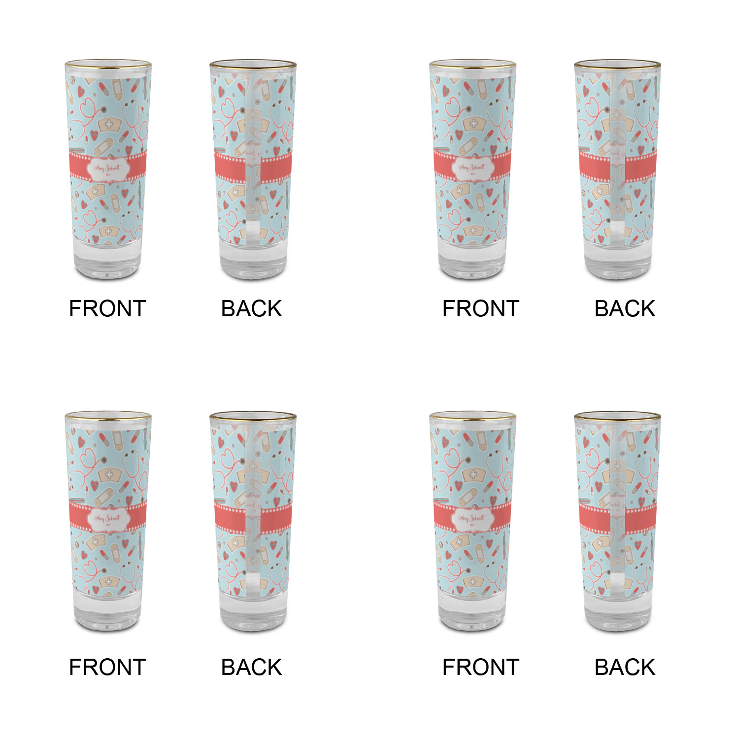 These glass shooter glasses are printed in full color with the design of your choice. These are a tall shooter 2 oz size and stand 4" tall. The print is a full wrap design to boldly display your personalization.