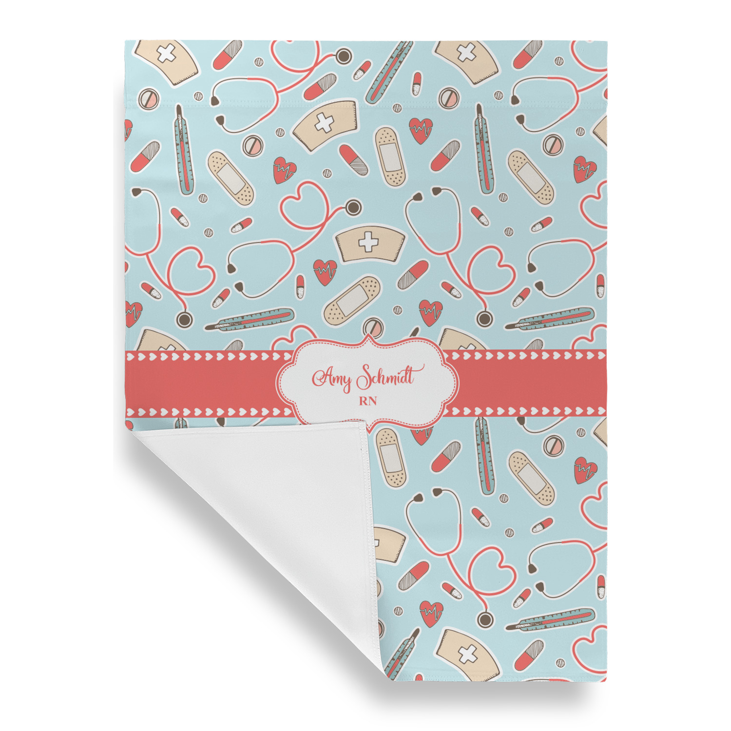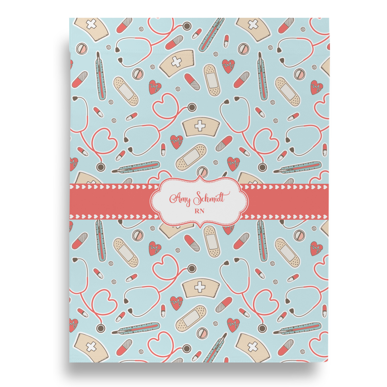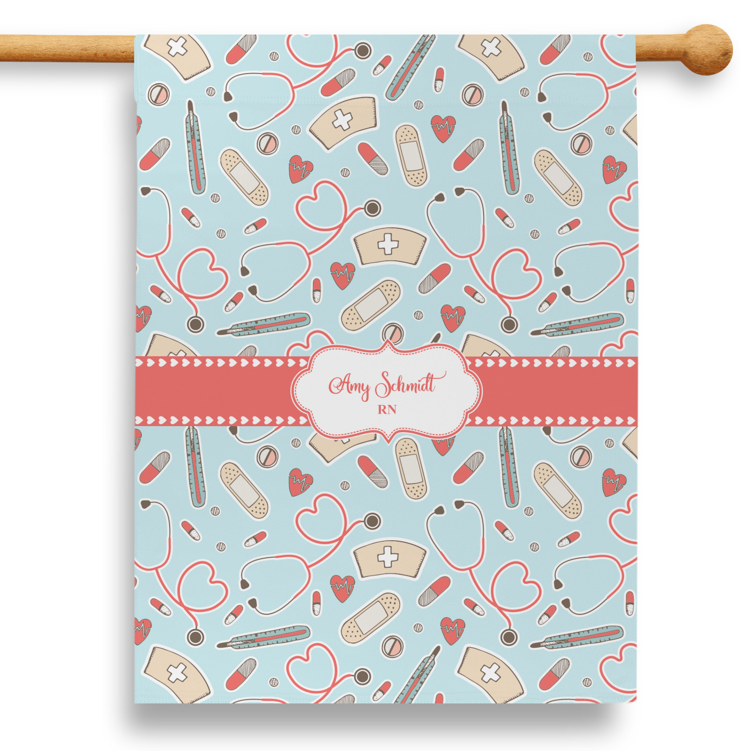 This design features a fun pattern with illustrations of different nursing tools, such as a stethescope, band aid, medicine, and more! The background is a light blue, while the ribbon is a coral color. There is a frame in the middle to put your personalization.
