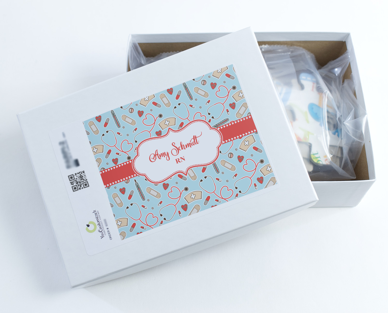 This design features a fun pattern with illustrations of different nursing tools, such as a stethescope, band aid, medicine, and more! The background is a light blue, while the ribbon is a coral color. There is a frame in the middle to put your personalization.