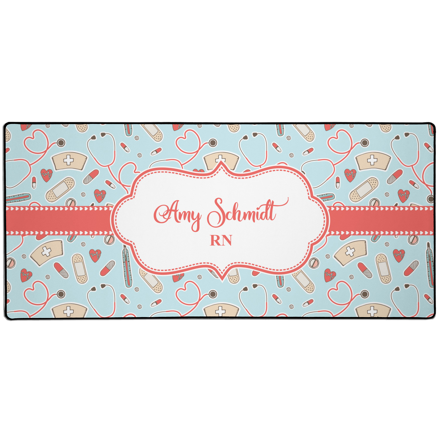 This design features a fun pattern with illustrations of different nursing tools, such as a stethescope, band aid, medicine, and more! The background is a light blue, while the ribbon is a coral color. There is a frame in the middle to put your personalization.