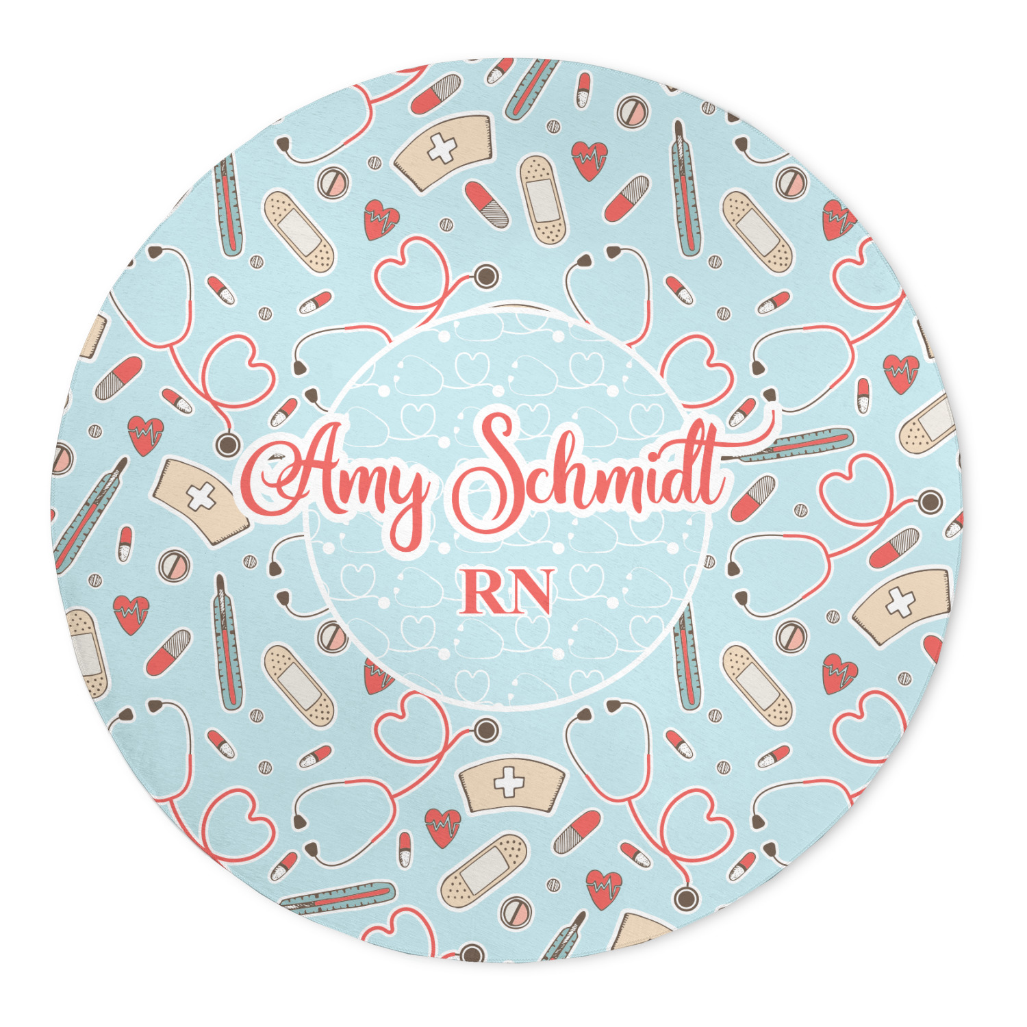 This design features a fun pattern with illustrations of different nursing tools, such as a stethescope, band aid, medicine, and more! The background is a light blue, while the ribbon is a coral color. There is a frame in the middle to put your personalization.