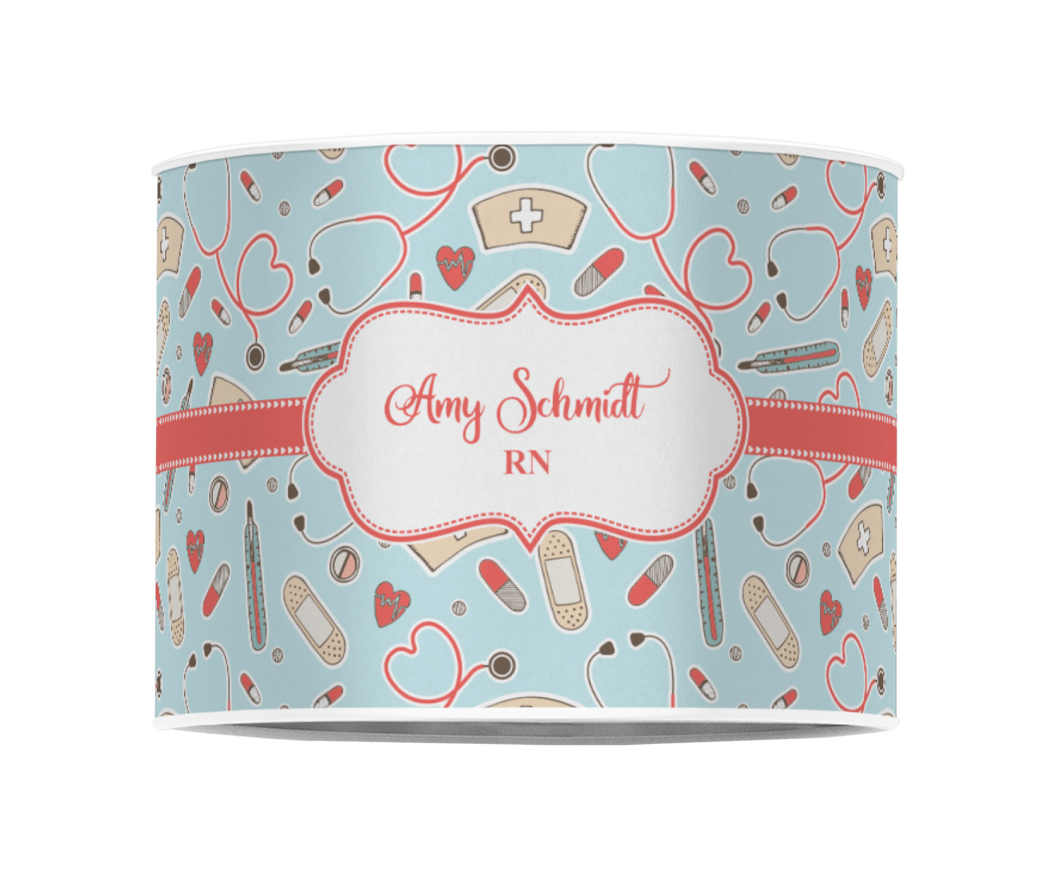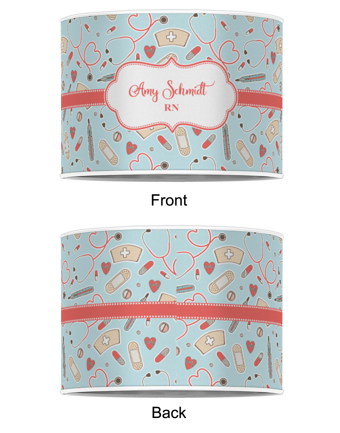This design features a fun pattern with illustrations of different nursing tools, such as a stethescope, band aid, medicine, and more! The background is a light blue, while the ribbon is a coral color. There is a frame in the middle to put your personalization.