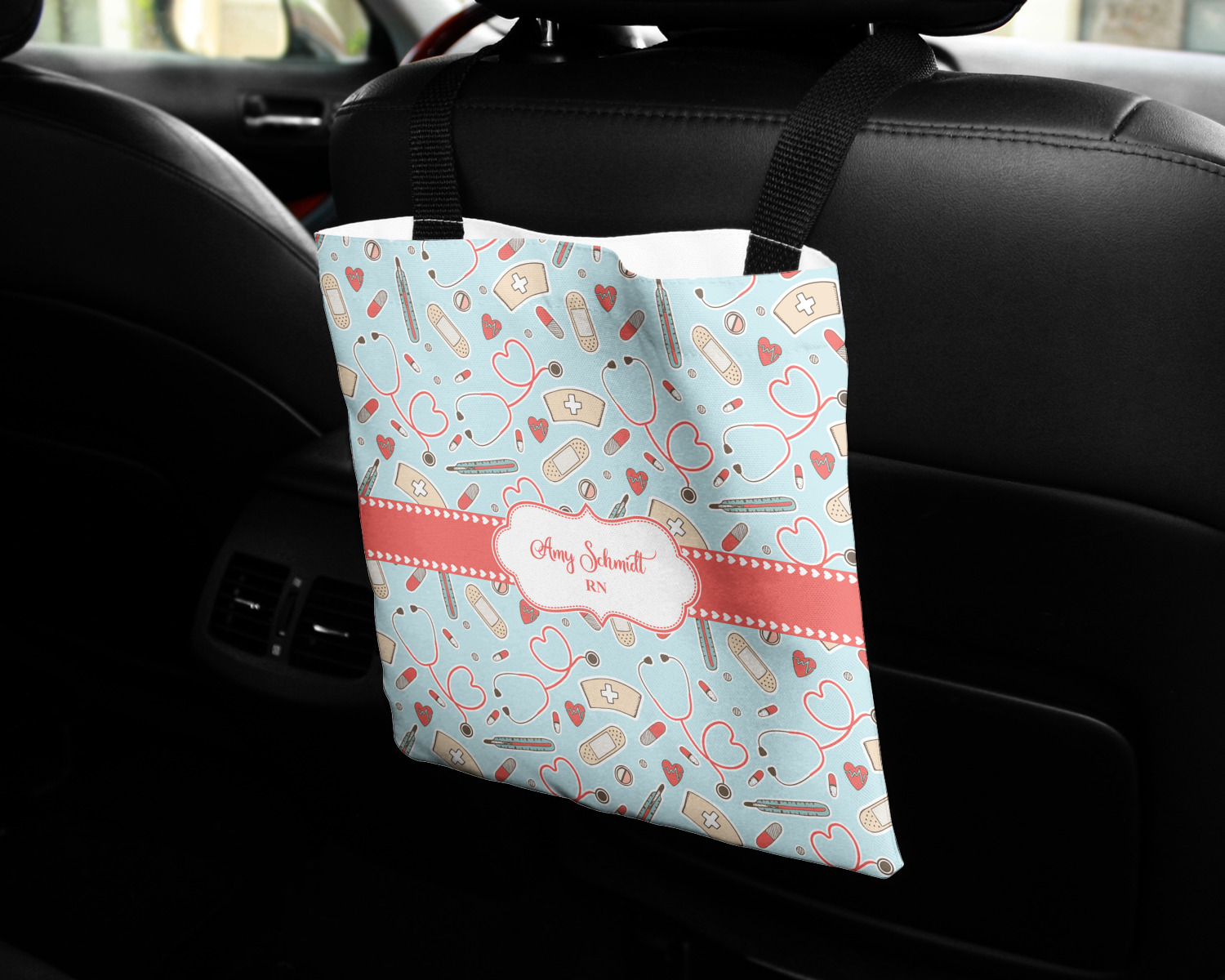 These car back seat organizers are sturdy tote-like bags, fabricated from a robust polyester, and features a single handle on the back side. The strap features an attachable velcro for easy attachment to headrests, grocery carts, car seats, and more. Simply undo the velcro, loop the strap around the headrest, reattach the velcro, and let the organizer hang from the front seat. These car organizers are the perfect means of increasing your backseat's legroom, while storing multiple items in one place for better accessibility. Each car back seat organizer measures at 10 by 10 inches, and features your personalized design printed across its front and back.