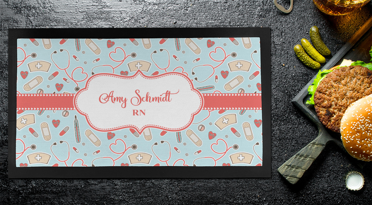 This design features a fun pattern with illustrations of different nursing tools, such as a stethescope, band aid, medicine, and more! The background is a light blue, while the ribbon is a coral color. There is a frame in the middle to put your personalization.