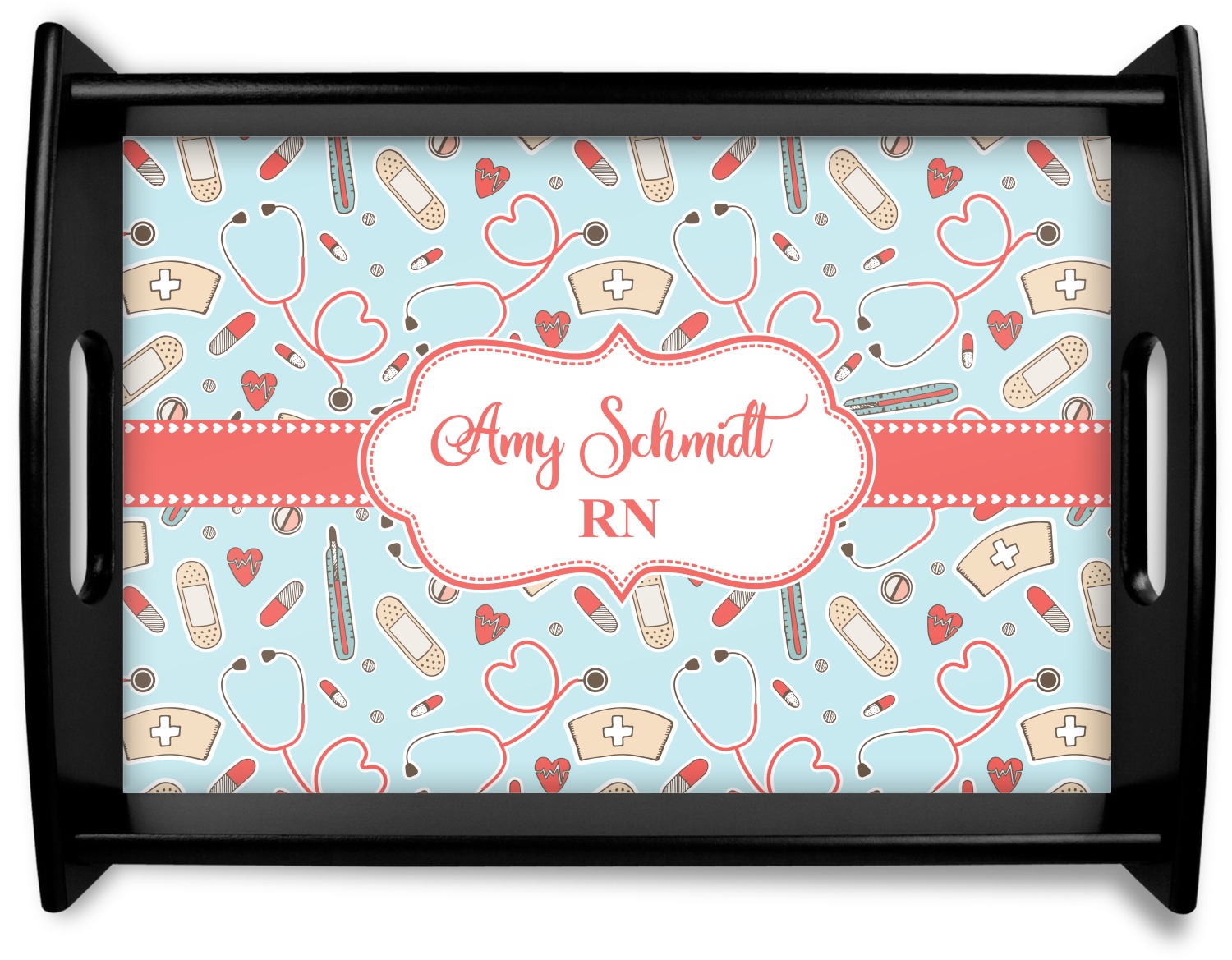 This design features a fun pattern with illustrations of different nursing tools, such as a stethescope, band aid, medicine, and more! The background is a light blue, while the ribbon is a coral color. There is a frame in the middle to put your personalization.