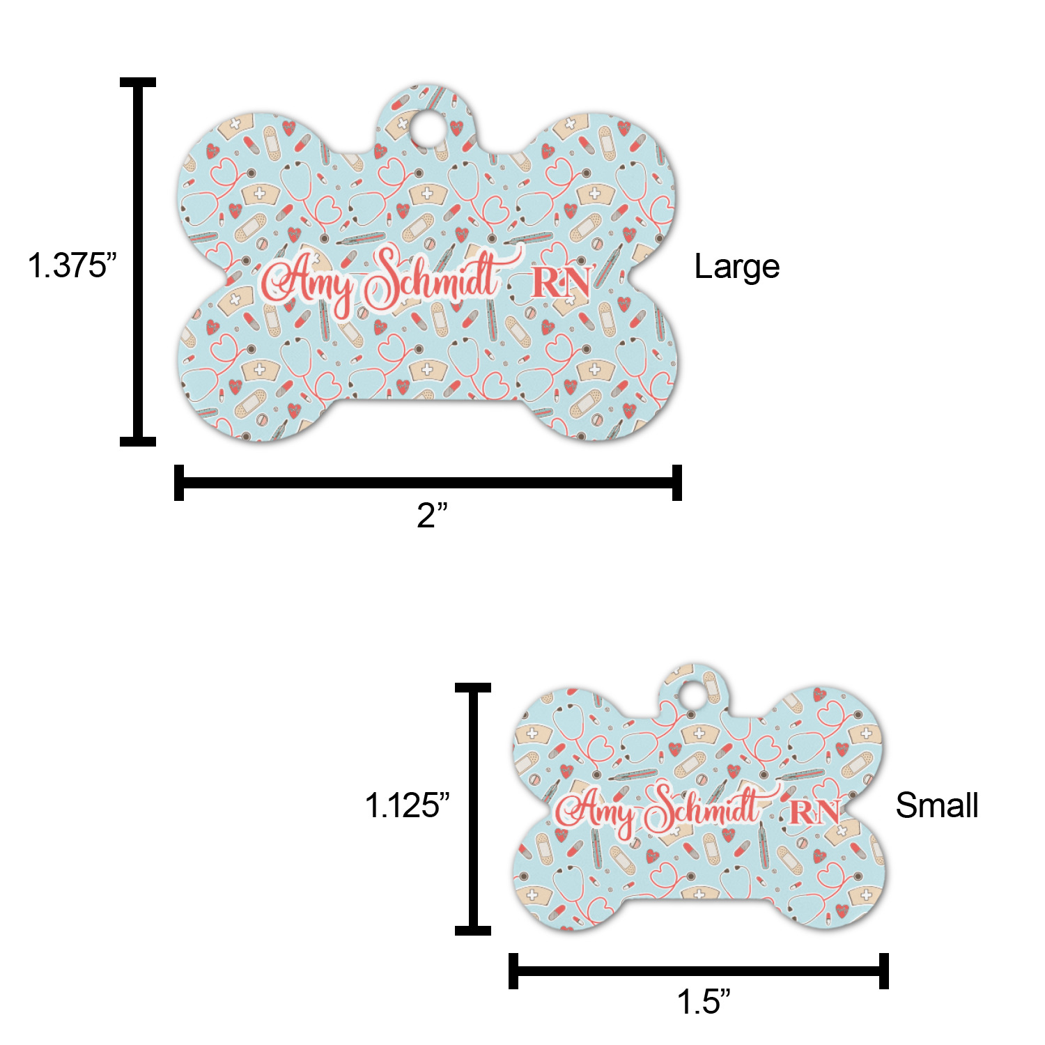 The small bone dog tag size is perfect to pair with our small dog collars, the large size pairs well with our large dog collars.