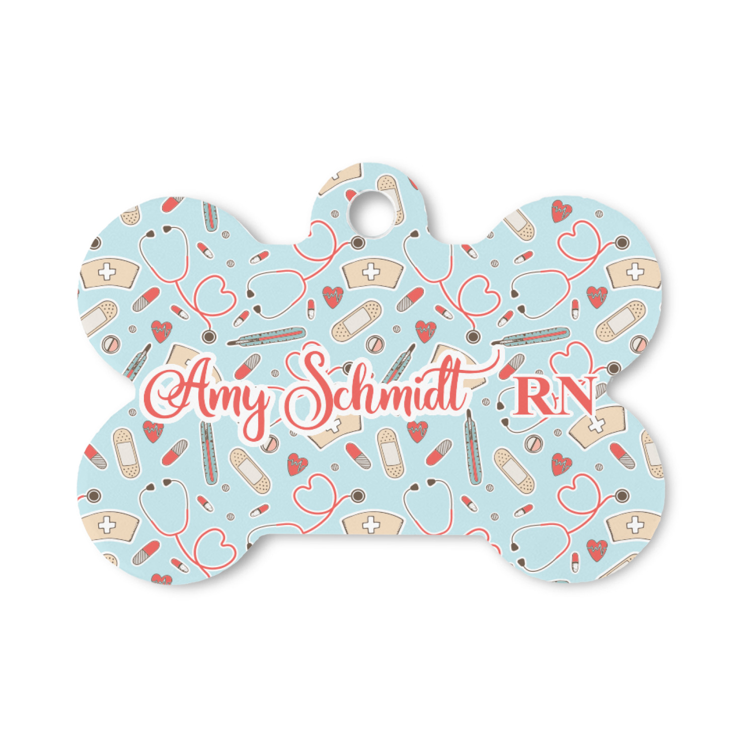 This design features a fun pattern with illustrations of different nursing tools, such as a stethescope, band aid, medicine, and more! The background is a light blue, while the ribbon is a coral color. There is a frame in the middle to put your personalization.