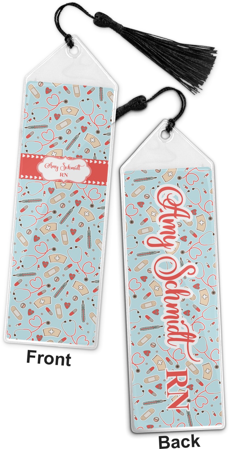 Your personalized bookmark is made of a sturdy, clear vinyl, and is approximately 7.5" x 2.25". We display your personalization on vinyl inserts that are placed on both sides. Accompanying each book marker is a black, fringe tassel that attaches to the reinforced, triangular header.