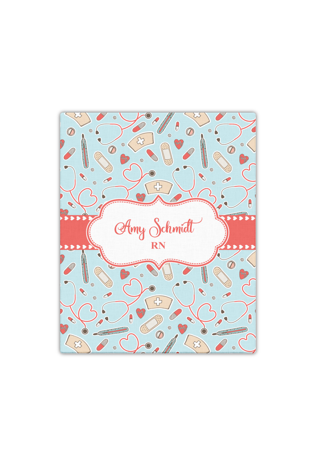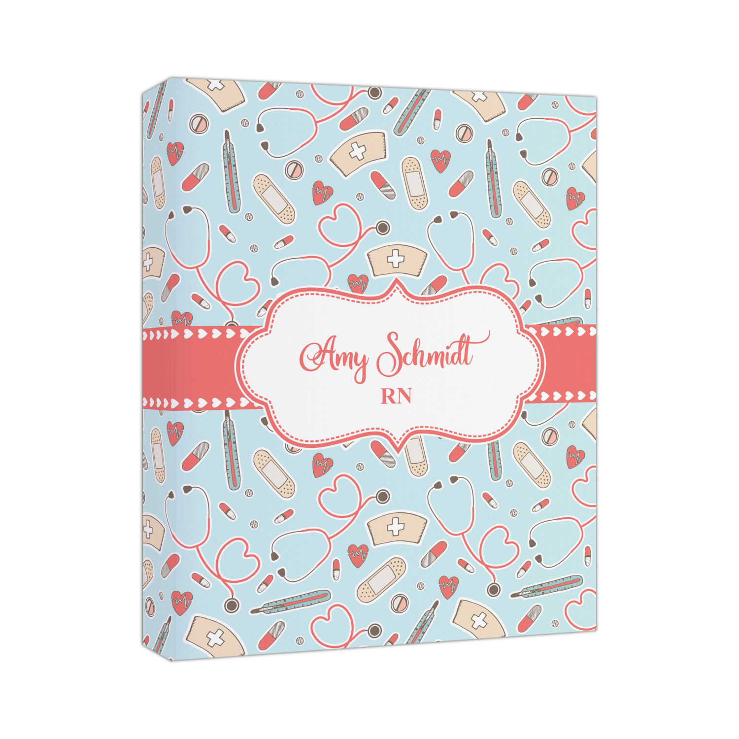 This design features a fun pattern with illustrations of different nursing tools, such as a stethescope, band aid, medicine, and more! The background is a light blue, while the ribbon is a coral color. There is a frame in the middle to put your personalization.