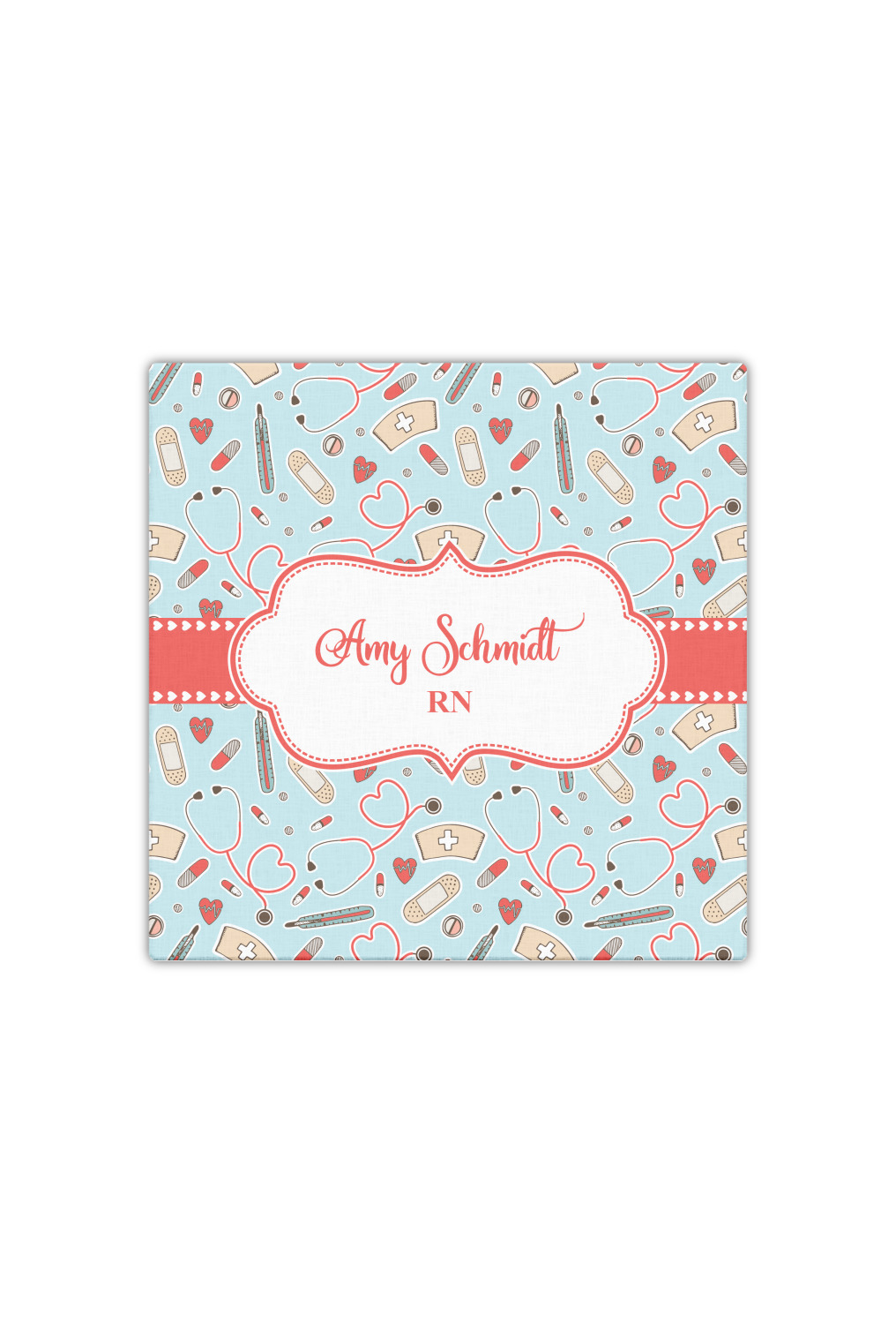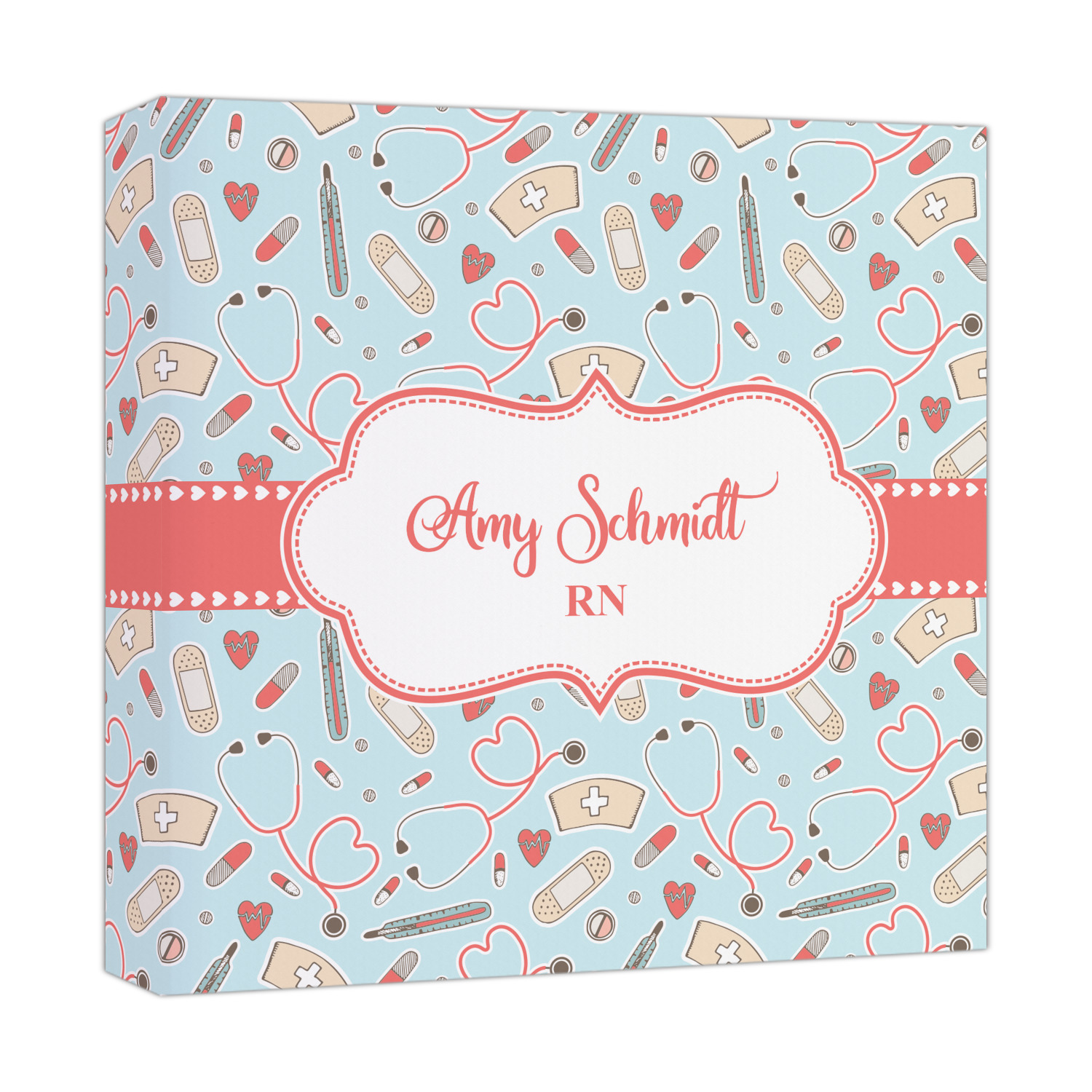 This design features a fun pattern with illustrations of different nursing tools, such as a stethescope, band aid, medicine, and more! The background is a light blue, while the ribbon is a coral color. There is a frame in the middle to put your personalization.