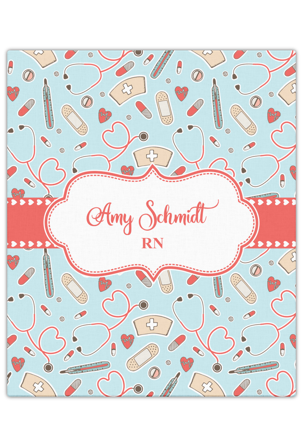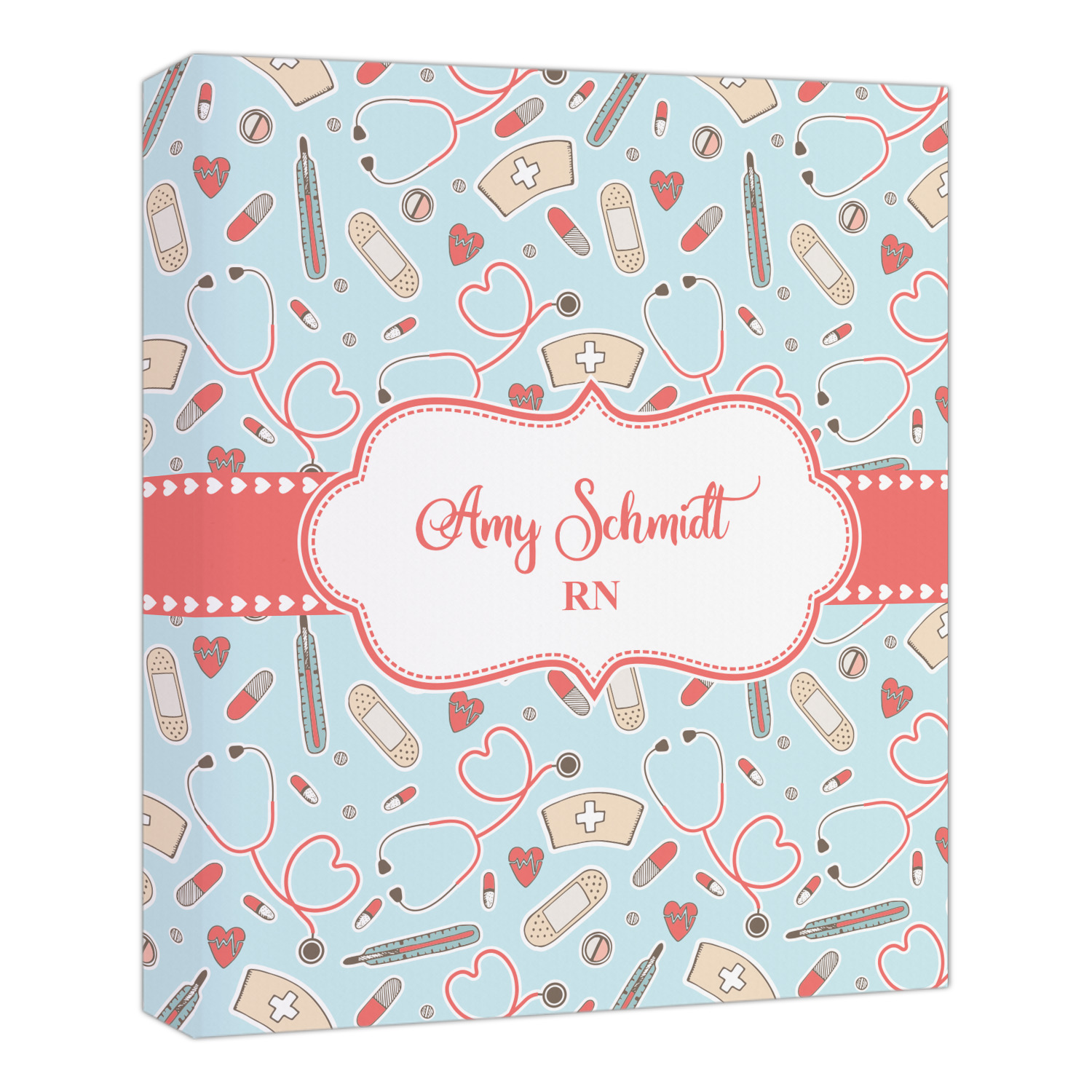 This design features a fun pattern with illustrations of different nursing tools, such as a stethescope, band aid, medicine, and more! The background is a light blue, while the ribbon is a coral color. There is a frame in the middle to put your personalization.