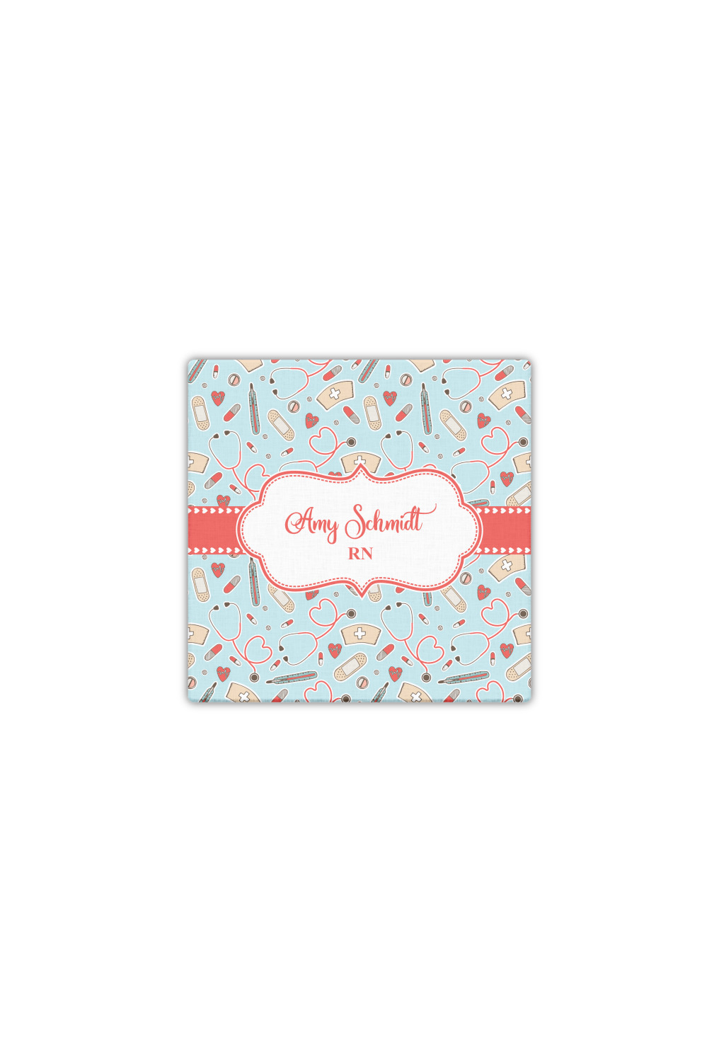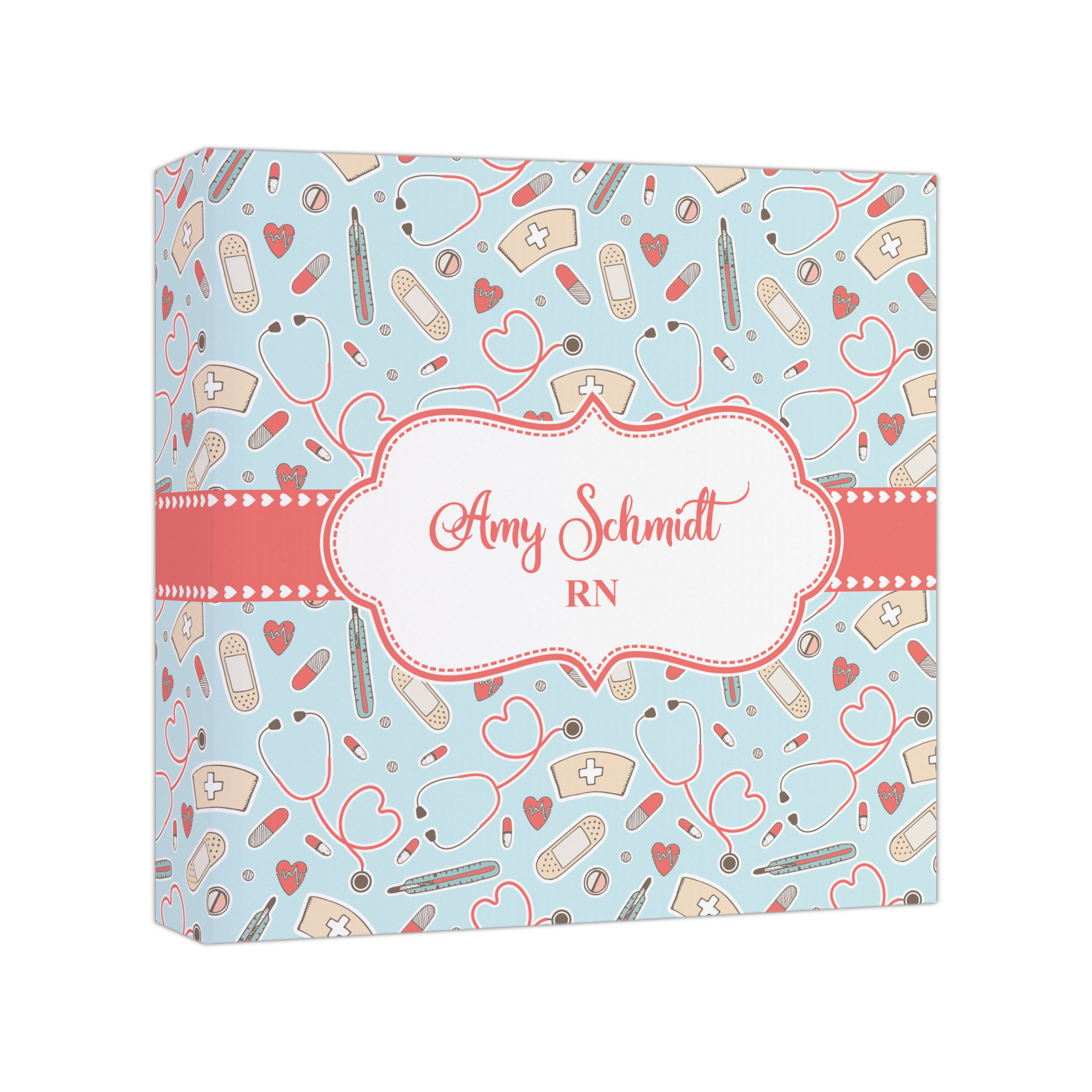 This design features a fun pattern with illustrations of different nursing tools, such as a stethescope, band aid, medicine, and more! The background is a light blue, while the ribbon is a coral color. There is a frame in the middle to put your personalization.