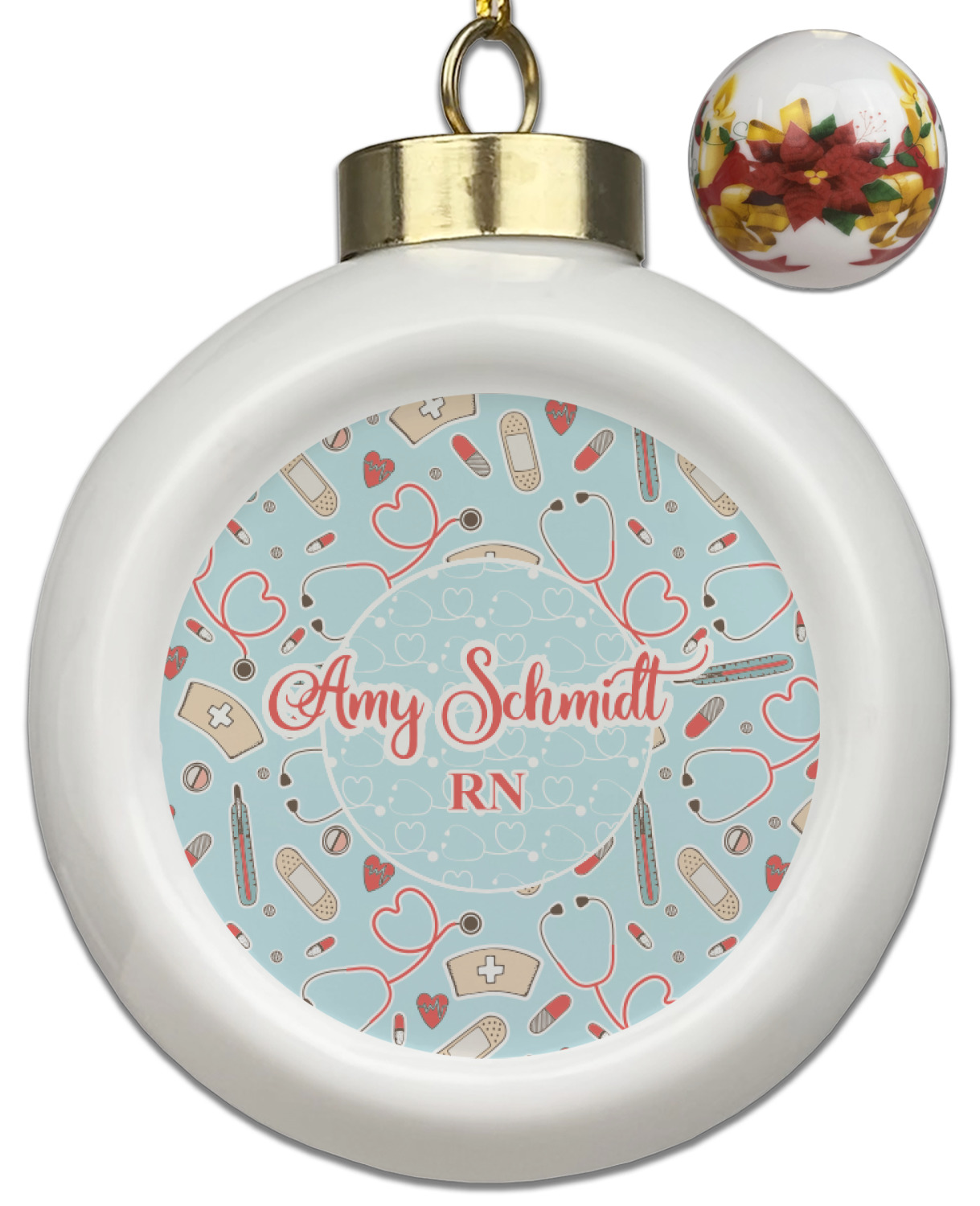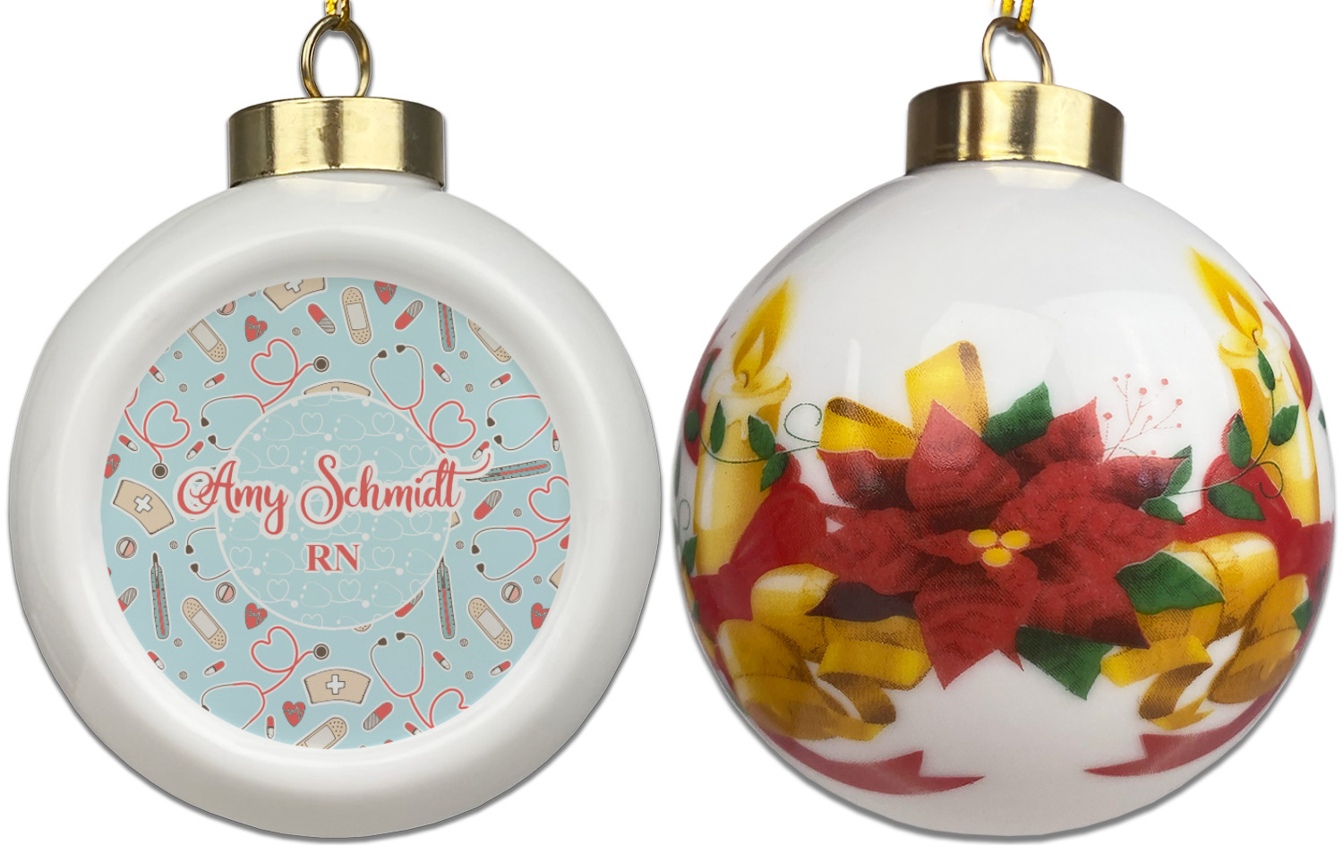 Our Christmas ornaments are a unique ceramic ball shape with a twist as it has a flat face to display your custom design! Select from one of our two design types - Christmas Tree or Poinsettia Garland - to adorn the curved back of your personal design. Each ornament measures 3H x 2.5W x 2D accompanied with a gold string accent for finishing touches to hang on your beautiful Christmas tree!