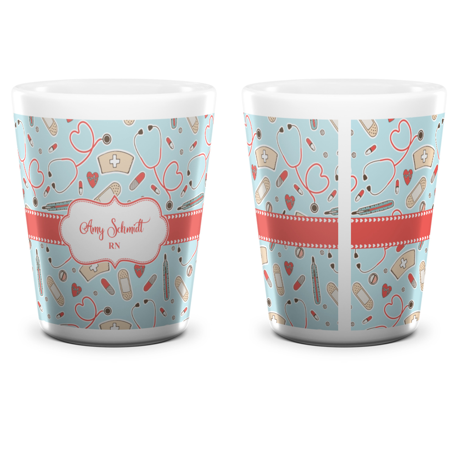 This design features a fun pattern with illustrations of different nursing tools, such as a stethescope, band aid, medicine, and more! The background is a light blue, while the ribbon is a coral color. There is a frame in the middle to put your personalization.