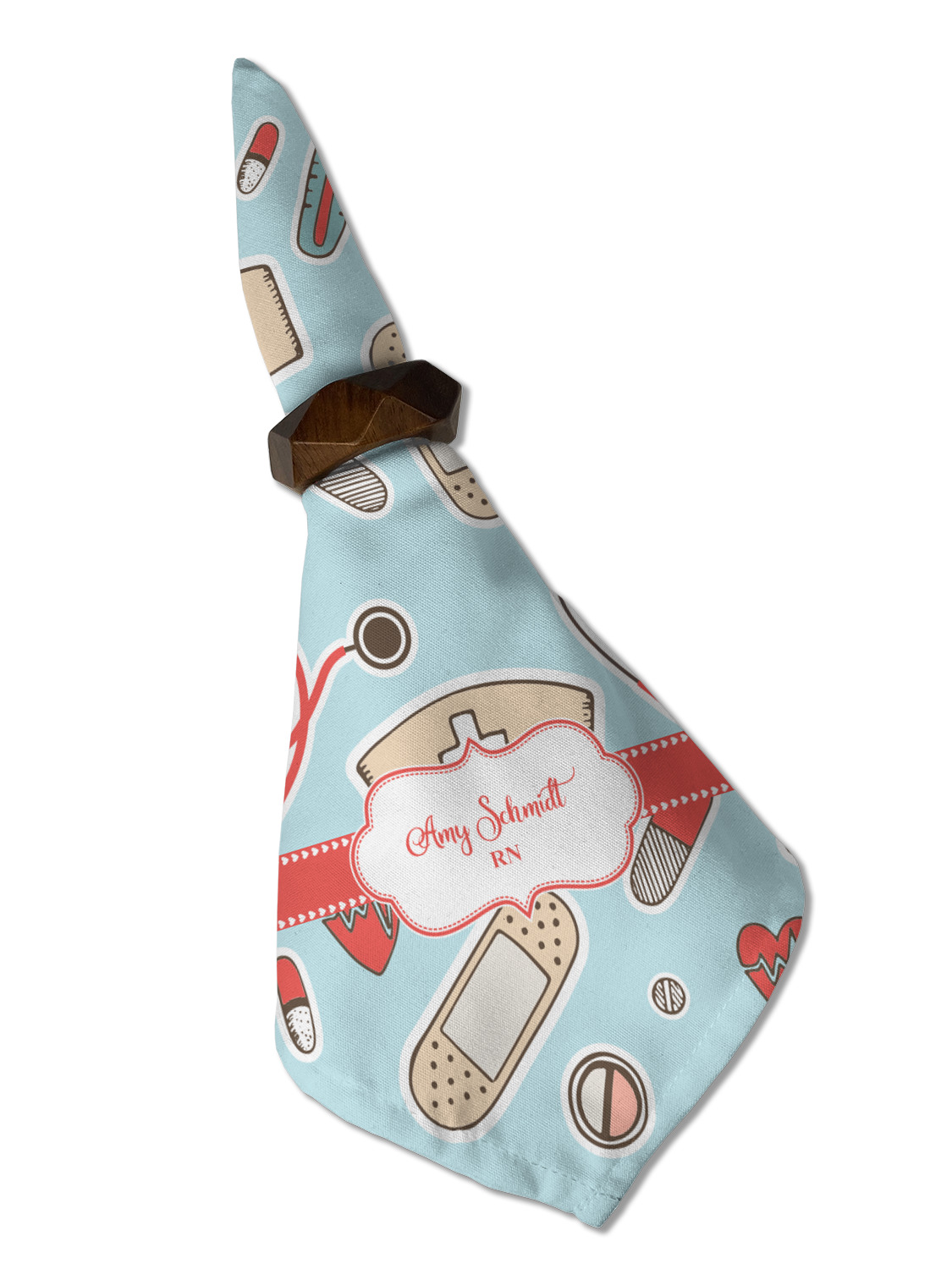 This design features a fun pattern with illustrations of different nursing tools, such as a stethescope, band aid, medicine, and more! The background is a light blue, while the ribbon is a coral color. There is a frame in the middle to put your personalization.