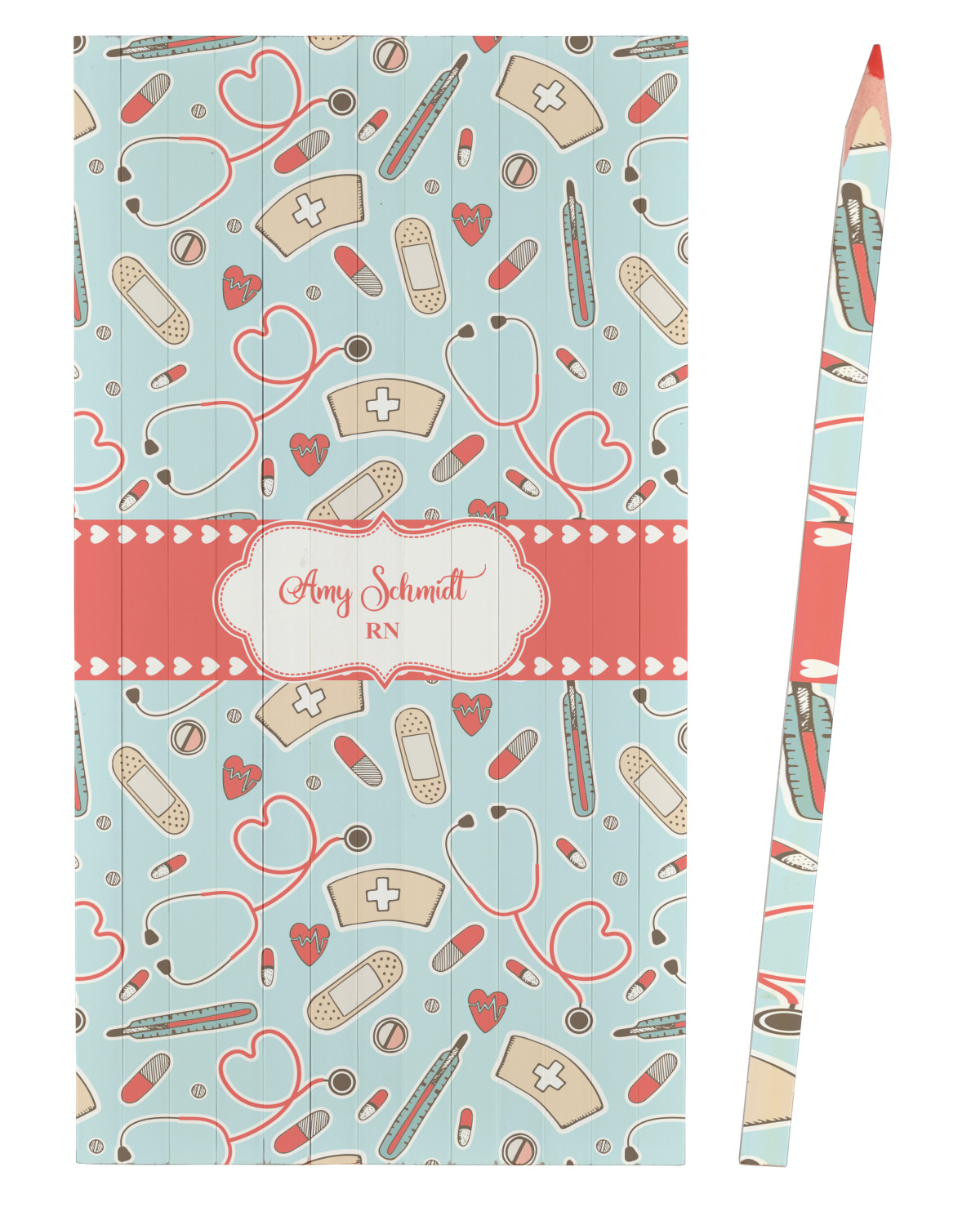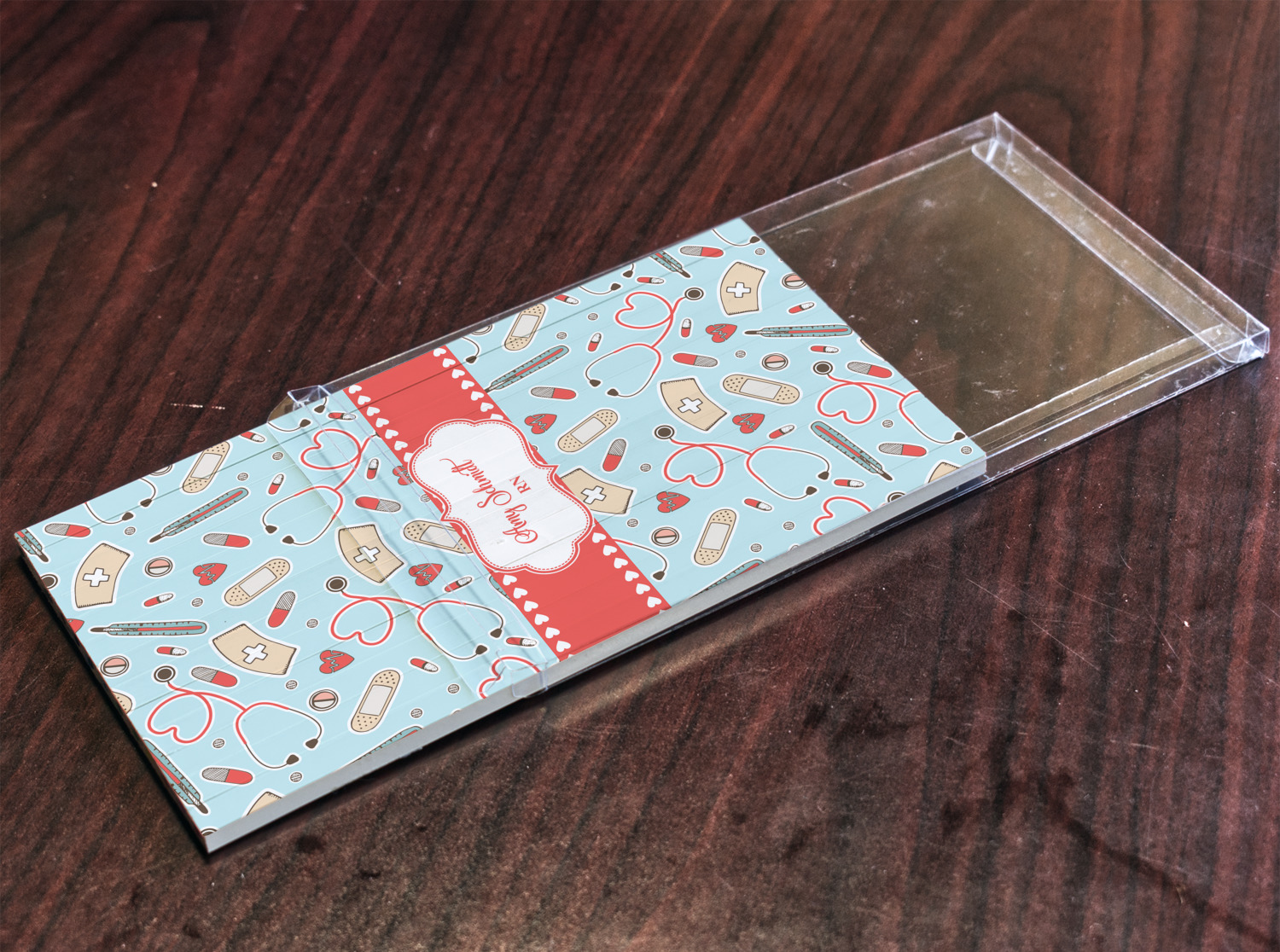 This design features a fun pattern with illustrations of different nursing tools, such as a stethescope, band aid, medicine, and more! The background is a light blue, while the ribbon is a coral color. There is a frame in the middle to put your personalization.