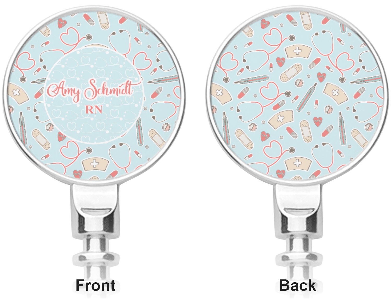 This design features a fun pattern with illustrations of different nursing tools, such as a stethescope, band aid, medicine, and more! The background is a light blue, while the ribbon is a coral color. There is a frame in the middle to put your personalization.