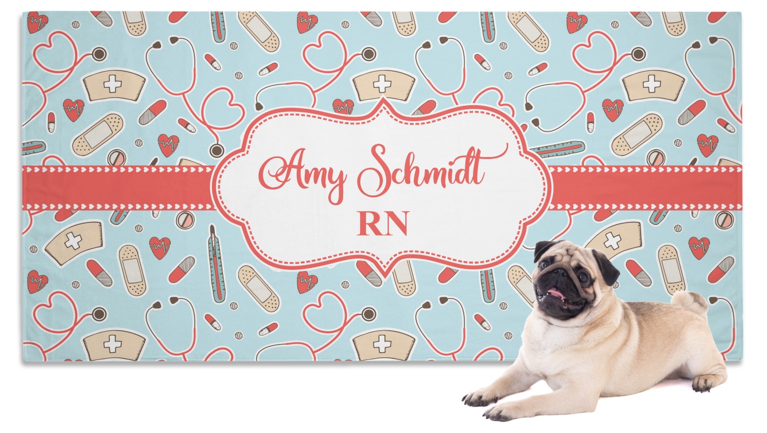 Our custom towels are crafted from a special blend of polyester and polyamide, which contributes to its lightweight, yet thoroughly absorbent nature. We craft it as such to guarantee efficiency as a convenient product; its lightweight nature makes it easy to roll up and carry along, yet it is still able to dry off even the wettest, muddiest pet. It measures at 60" x 30" and is sizable enough to dry off even the largest of pets. With our towel's gentle, soft-to-the-touch material, your pet will be sure to anticipate its warm, dry embrace. We print your personalized design on the front of the towel, while the back is white.
