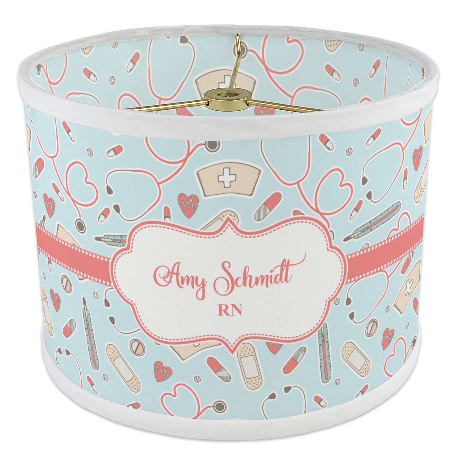 This design features a fun pattern with illustrations of different nursing tools, such as a stethescope, band aid, medicine, and more! The background is a light blue, while the ribbon is a coral color. There is a frame in the middle to put your personalization.