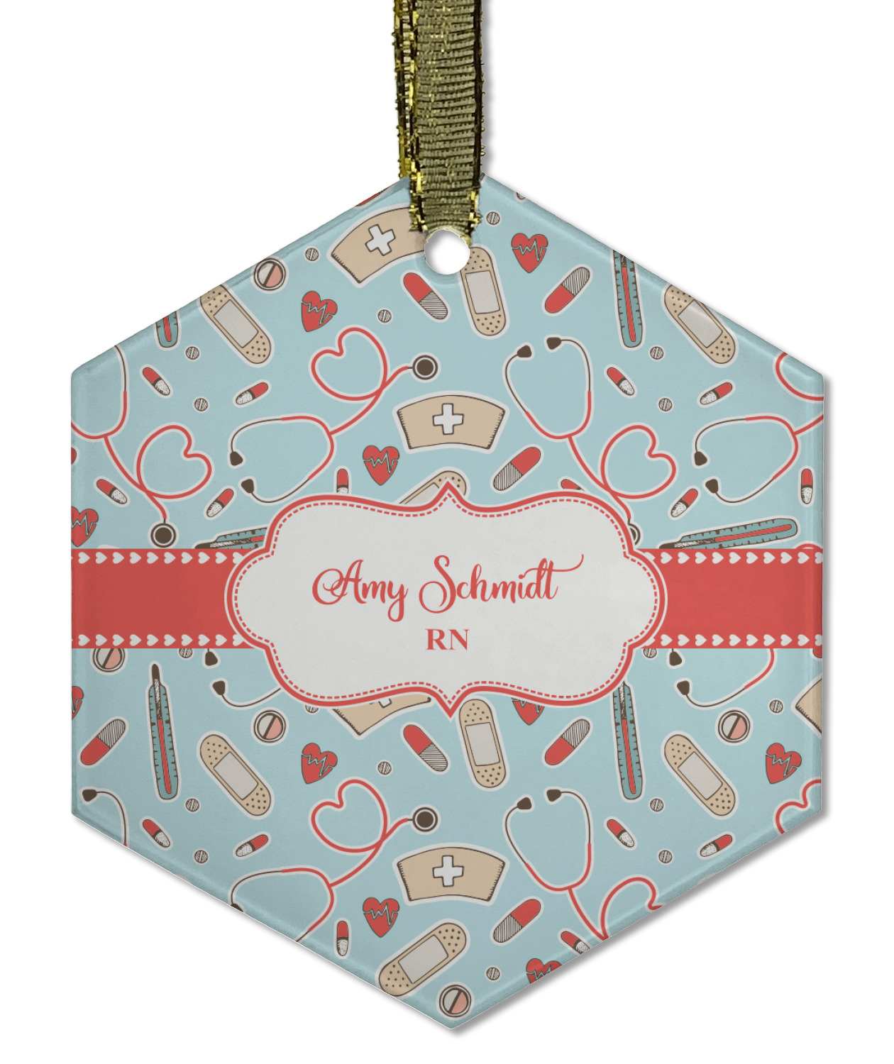 This design features a fun pattern with illustrations of different nursing tools, such as a stethescope, band aid, medicine, and more! The background is a light blue, while the ribbon is a coral color. There is a frame in the middle to put your personalization.