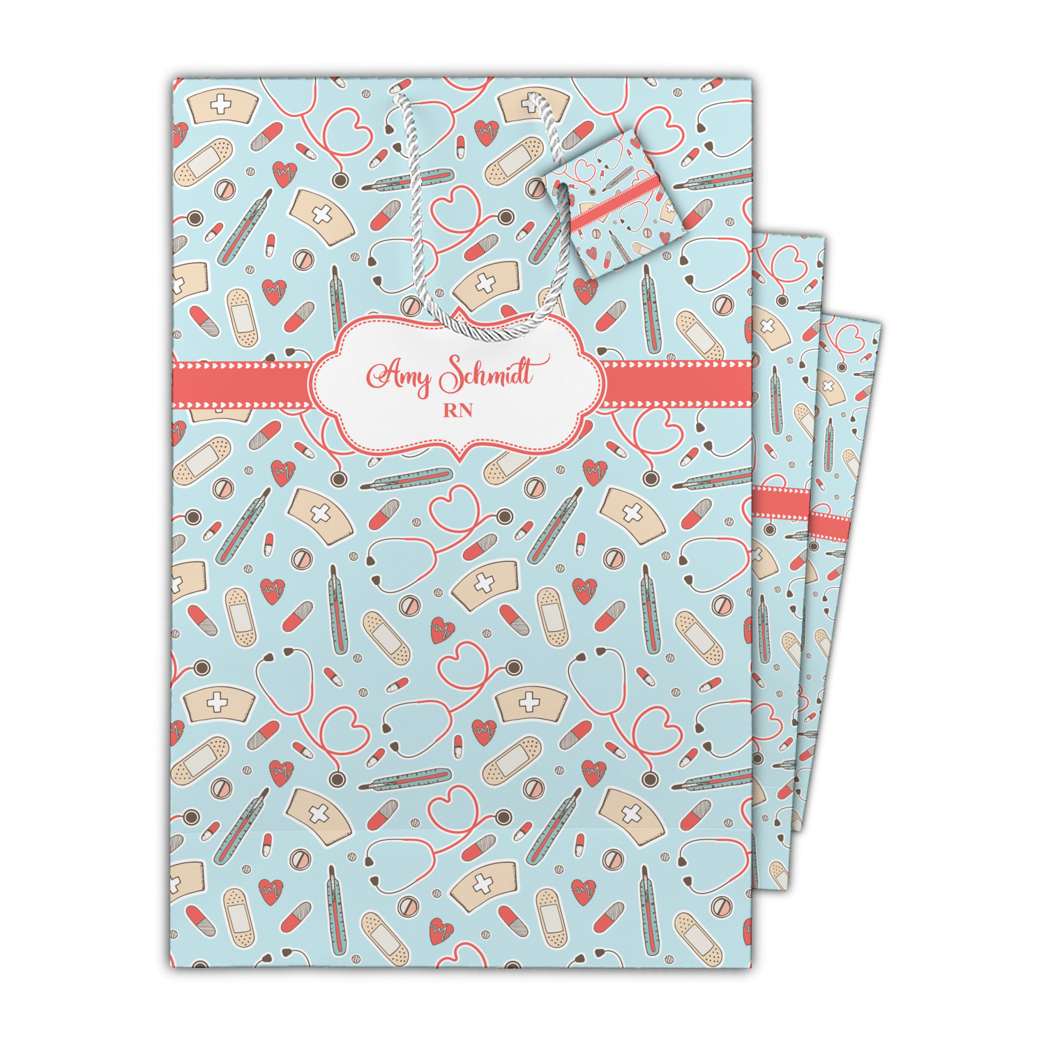 This design features a fun pattern with illustrations of different nursing tools, such as a stethescope, band aid, medicine, and more! The background is a light blue, while the ribbon is a coral color. There is a frame in the middle to put your personalization.