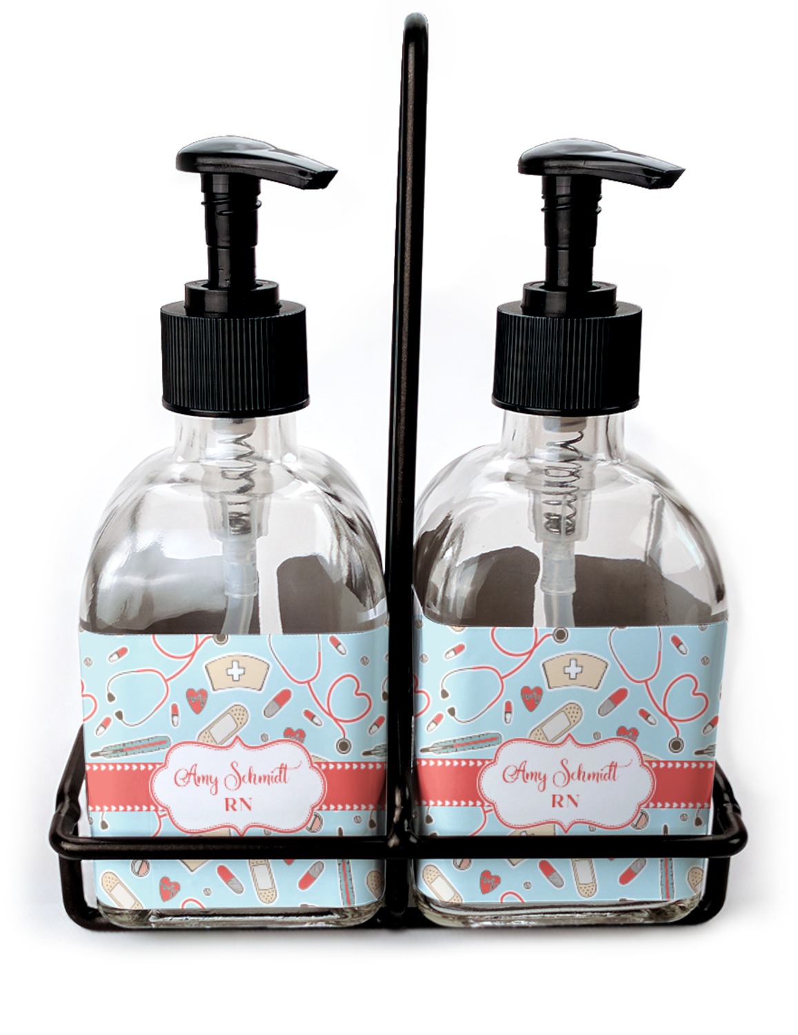 You can purchase these personalized soap dispensers as singulars, or as a set with two bottles. With your purchase of the set, we include a black frame that complements the black color of the pumps and adds to the overall classy look of the piece.