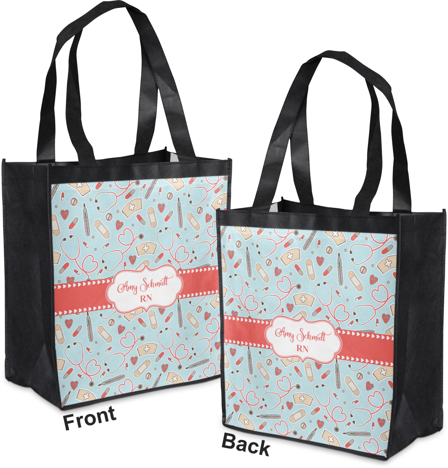 This design features a fun pattern with illustrations of different nursing tools, such as a stethescope, band aid, medicine, and more! The background is a light blue, while the ribbon is a coral color. There is a frame in the middle to put your personalization.