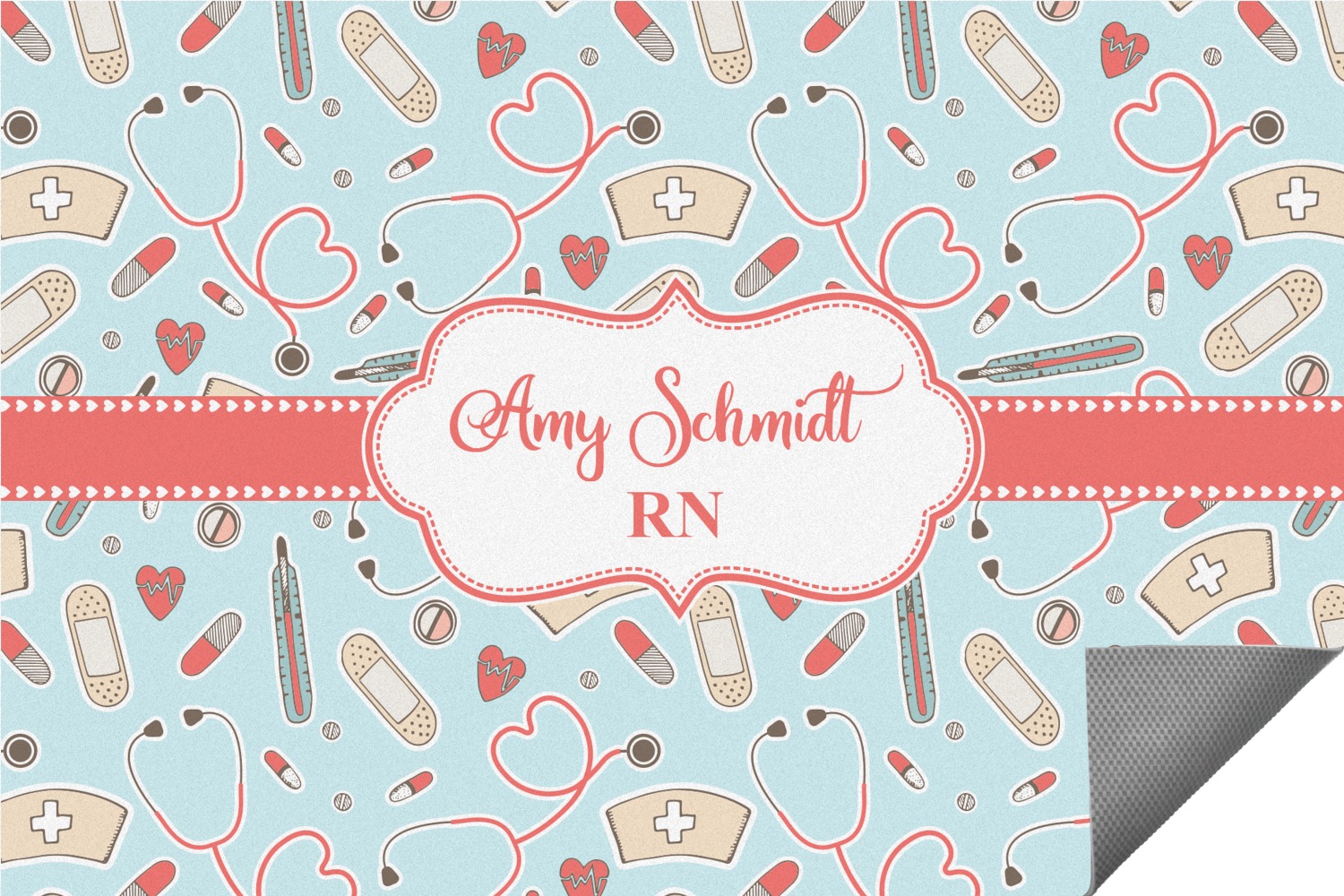 This design features a fun pattern with illustrations of different nursing tools, such as a stethescope, band aid, medicine, and more! The background is a light blue, while the ribbon is a coral color. There is a frame in the middle to put your personalization.