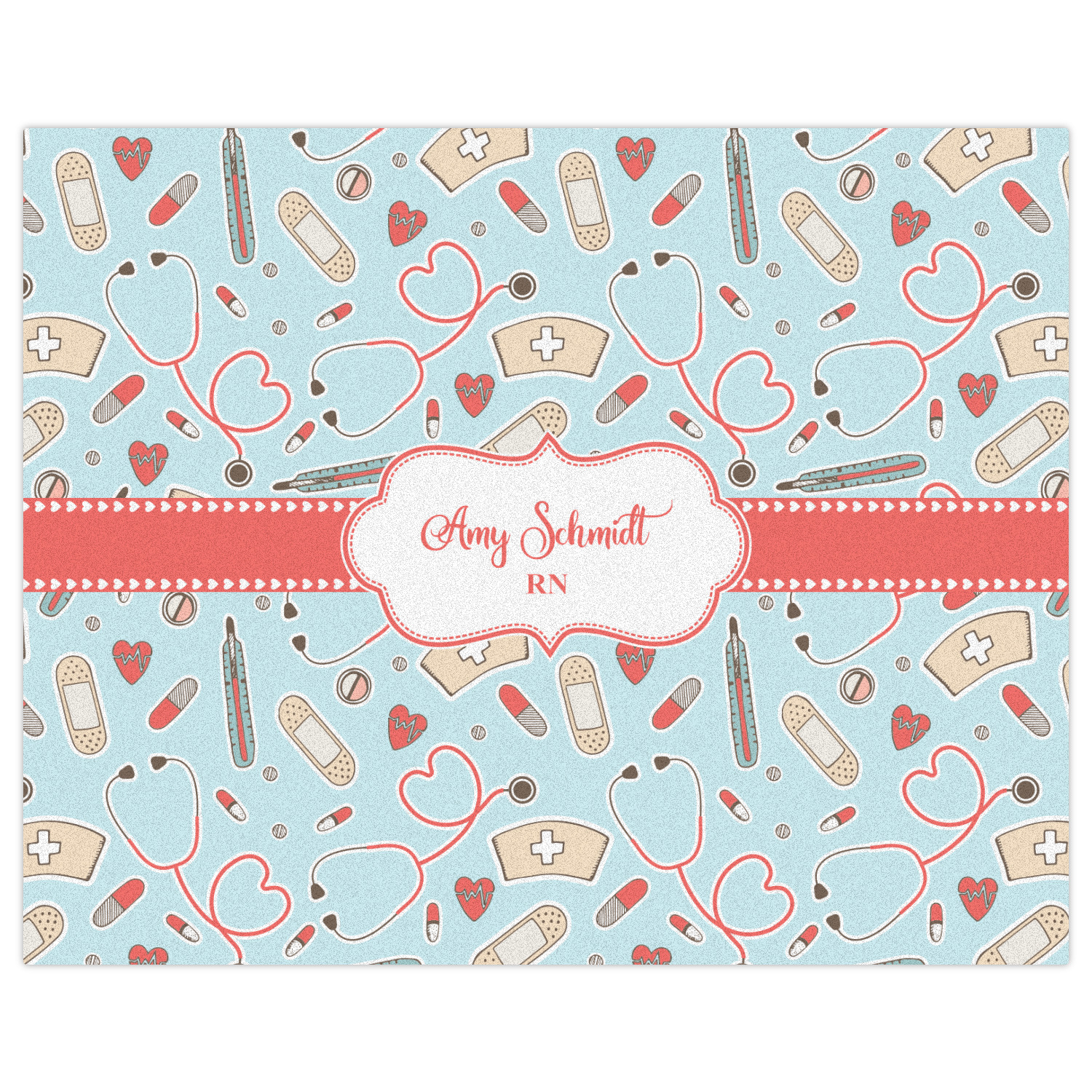 This design features a fun pattern with illustrations of different nursing tools, such as a stethescope, band aid, medicine, and more! The background is a light blue, while the ribbon is a coral color. There is a frame in the middle to put your personalization.