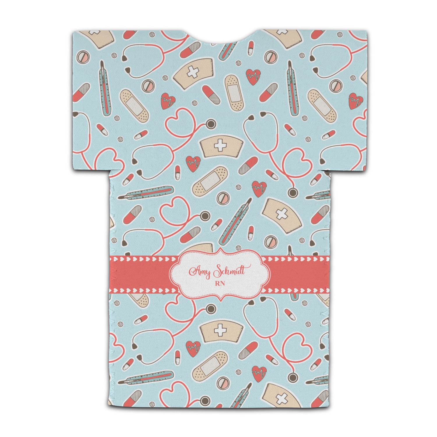 This design features a fun pattern with illustrations of different nursing tools, such as a stethescope, band aid, medicine, and more! The background is a light blue, while the ribbon is a coral color. There is a frame in the middle to put your personalization.