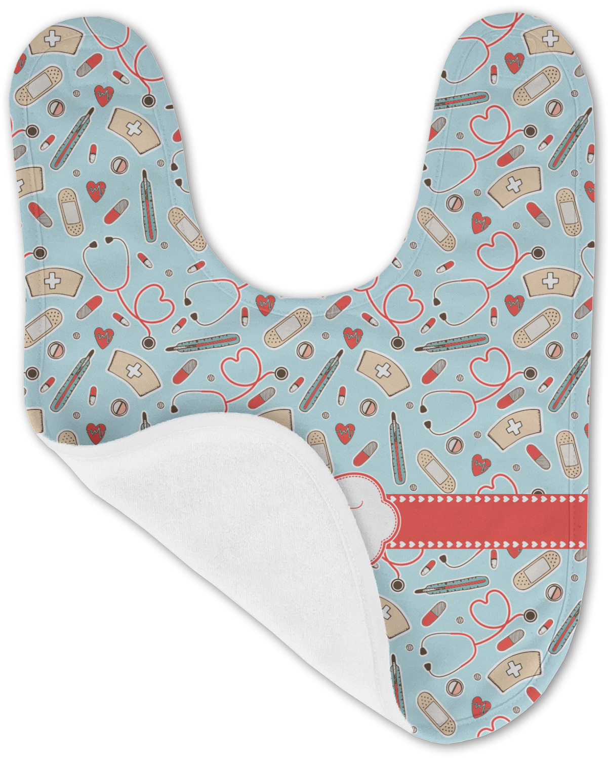 This design features a fun pattern with illustrations of different nursing tools, such as a stethescope, band aid, medicine, and more! The background is a light blue, while the ribbon is a coral color. There is a frame in the middle to put your personalization.