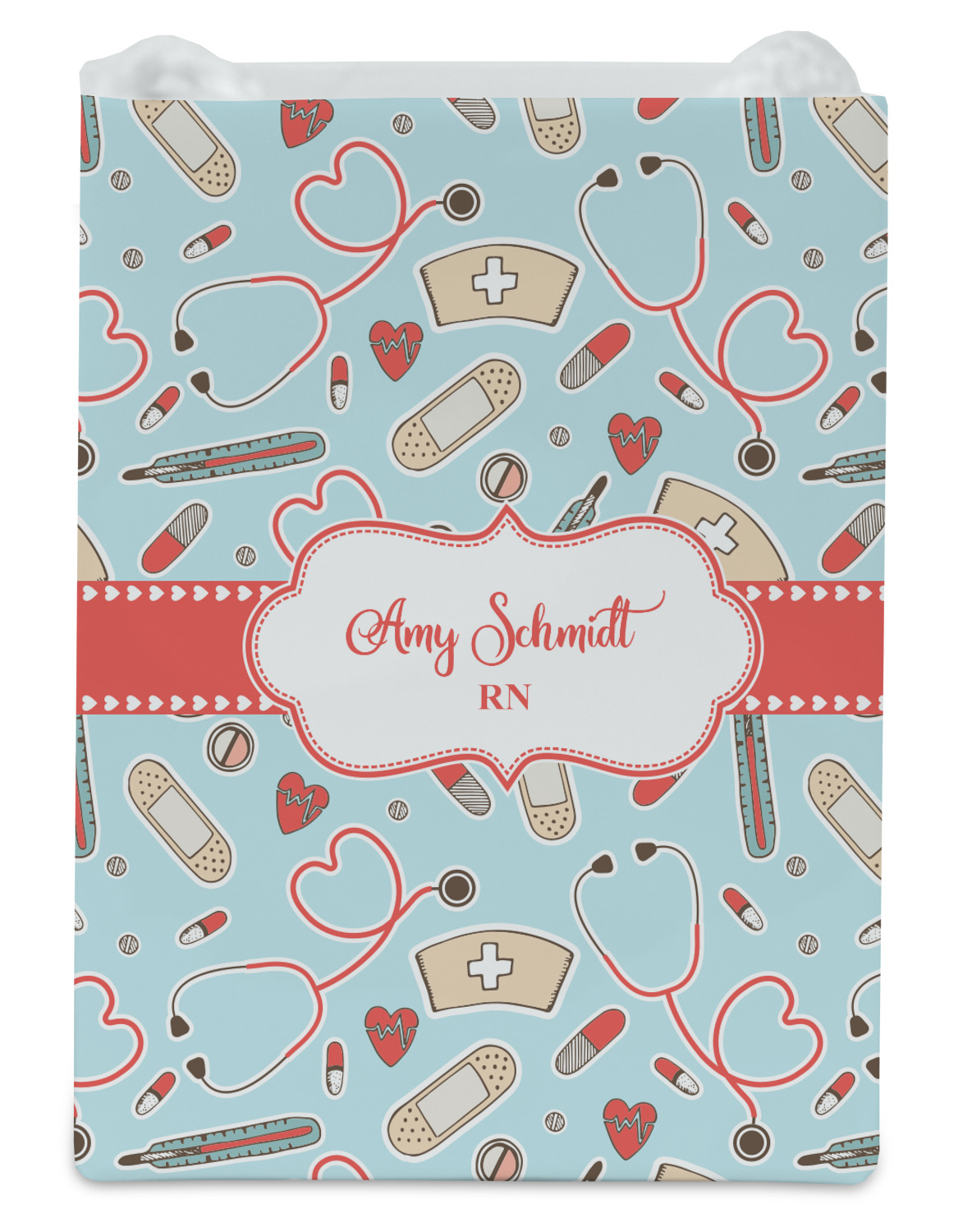 This design features a fun pattern with illustrations of different nursing tools, such as a stethescope, band aid, medicine, and more! The background is a light blue, while the ribbon is a coral color. There is a frame in the middle to put your personalization.