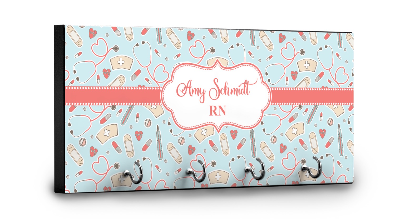 This design features a fun pattern with illustrations of different nursing tools, such as a stethescope, band aid, medicine, and more! The background is a light blue, while the ribbon is a coral color. There is a frame in the middle to put your personalization.