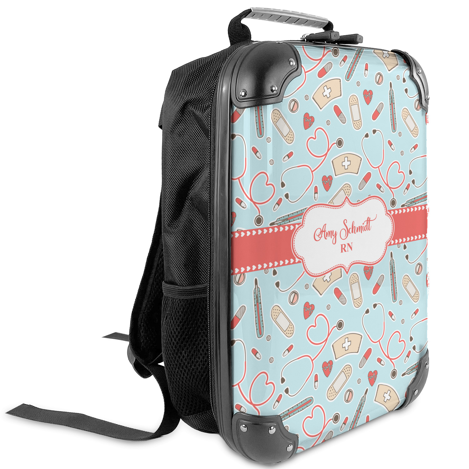 This design features a fun pattern with illustrations of different nursing tools, such as a stethescope, band aid, medicine, and more! The background is a light blue, while the ribbon is a coral color. There is a frame in the middle to put your personalization.