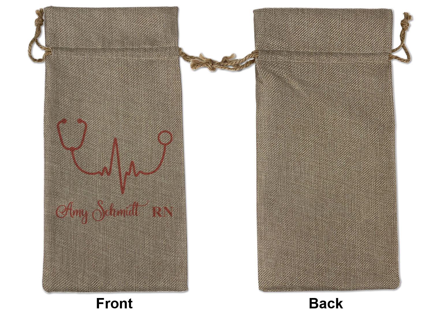 We sell our Burlap Gift Bags in 3 variant sized bags. Made with burlap polyester, each personalized bag can be secured with a twine drawstring pull. Your custom design is available to print on one side or both sides - completely up to you! The sizes of the bags measure approximately 4.5" x 6.5" for the smallest size, 6.5" x 8.0" for the medium size, and 6.5" x 13.5" for the large-sized bag.