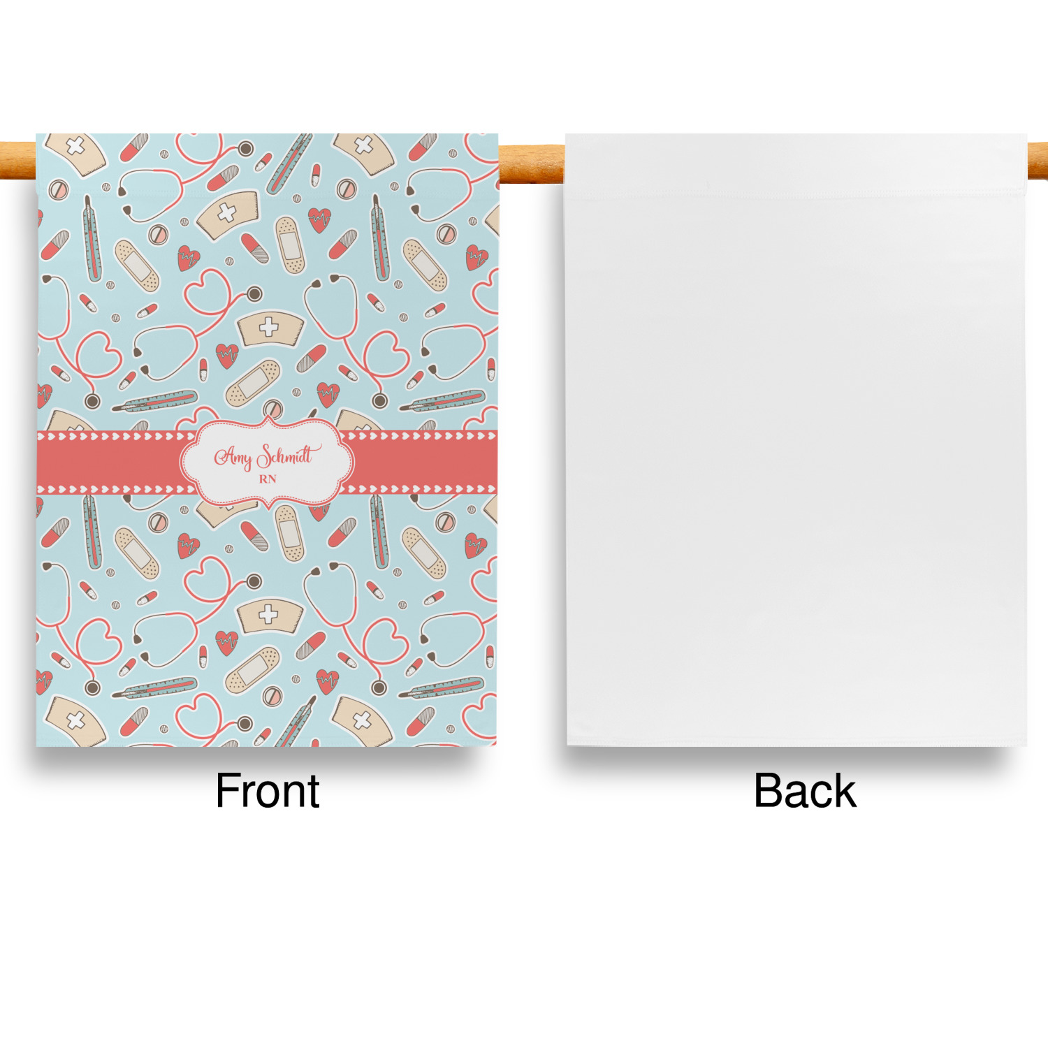 These custom garden flags are made of a durable, double-ply, polyester weave, allowing them to withstand the elements year round. The small flags measure at approximately 12 by 18 inches. The large flags measure out to 28 by 37 inches. You can order these decorative flags with your customization printed on the front only, or the front and back.