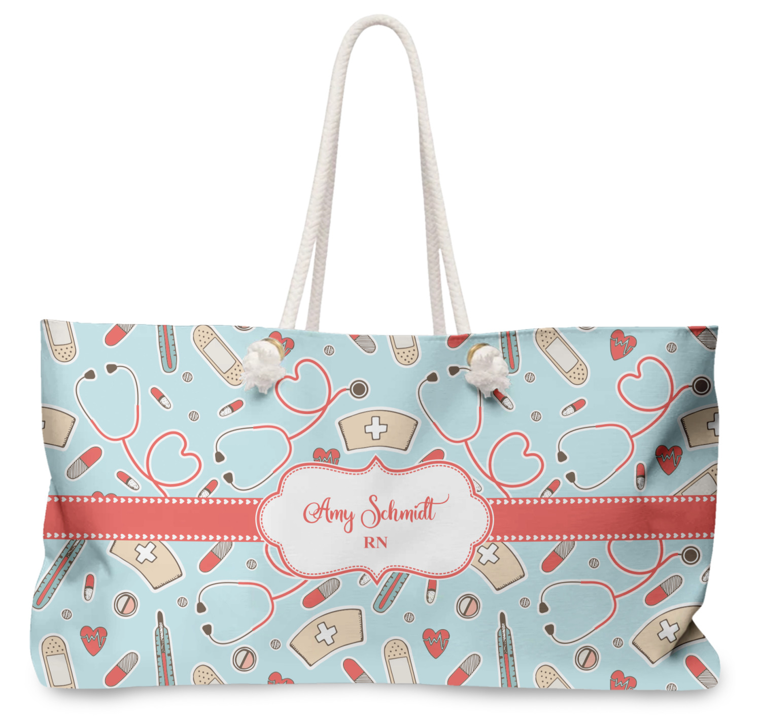 Our oversized weekender tote with rope handles is perfect for your weekend at the beach or on the town. This large tote are 24" W X 13" H, with a 5" gusset and a 27" thick rope handles with a knot that is put through a grommeted brass hole.