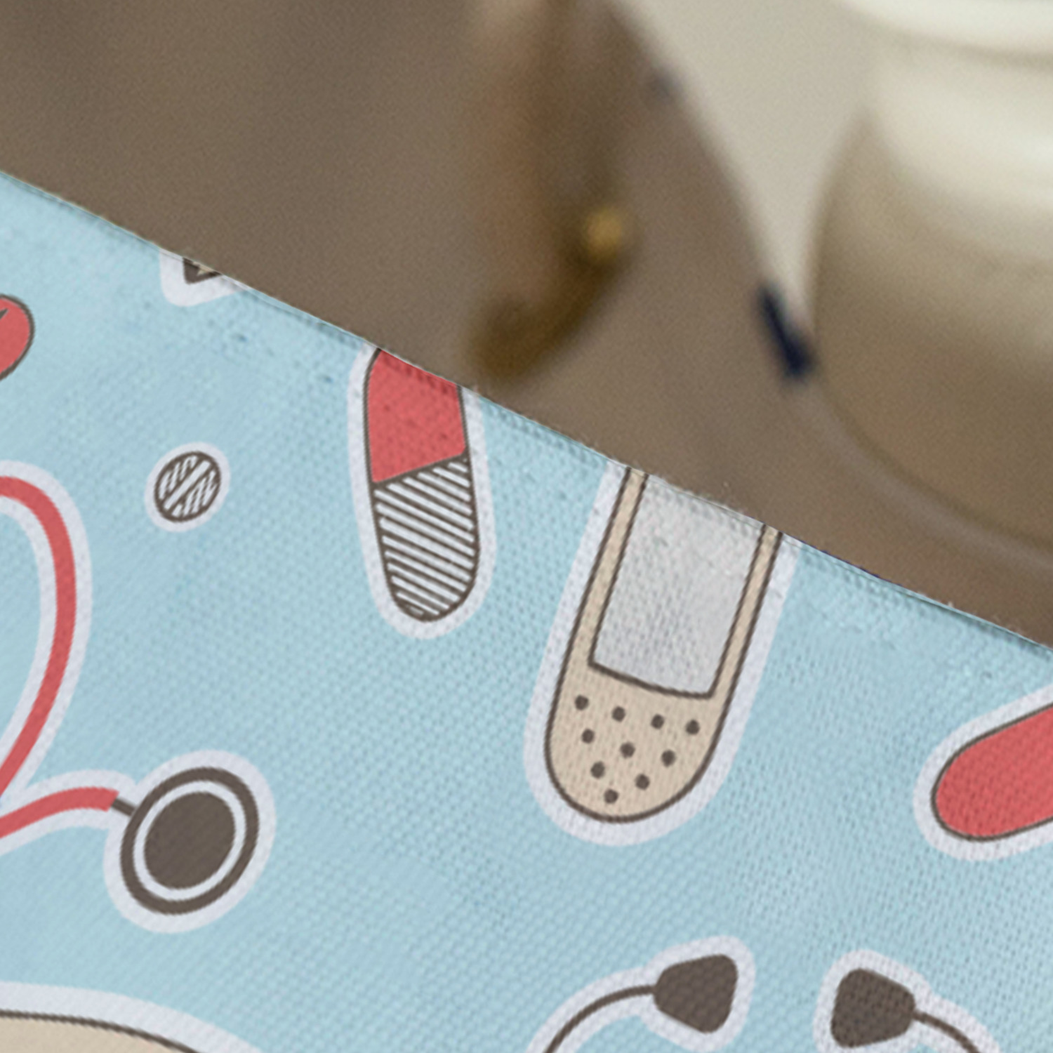This design features a fun pattern with illustrations of different nursing tools, such as a stethescope, band aid, medicine, and more! The background is a light blue, while the ribbon is a coral color. There is a frame in the middle to put your personalization.