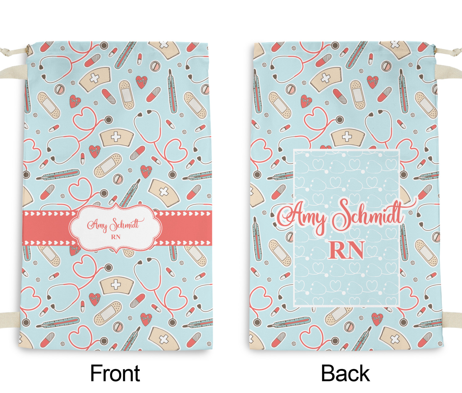 Carry your laundry in style with these customized laundry bags. Available in two sizes, featuring a natural colored woven strap and a cinch cord, these bags hold a lot of clothes or anything else you want to fit in them.