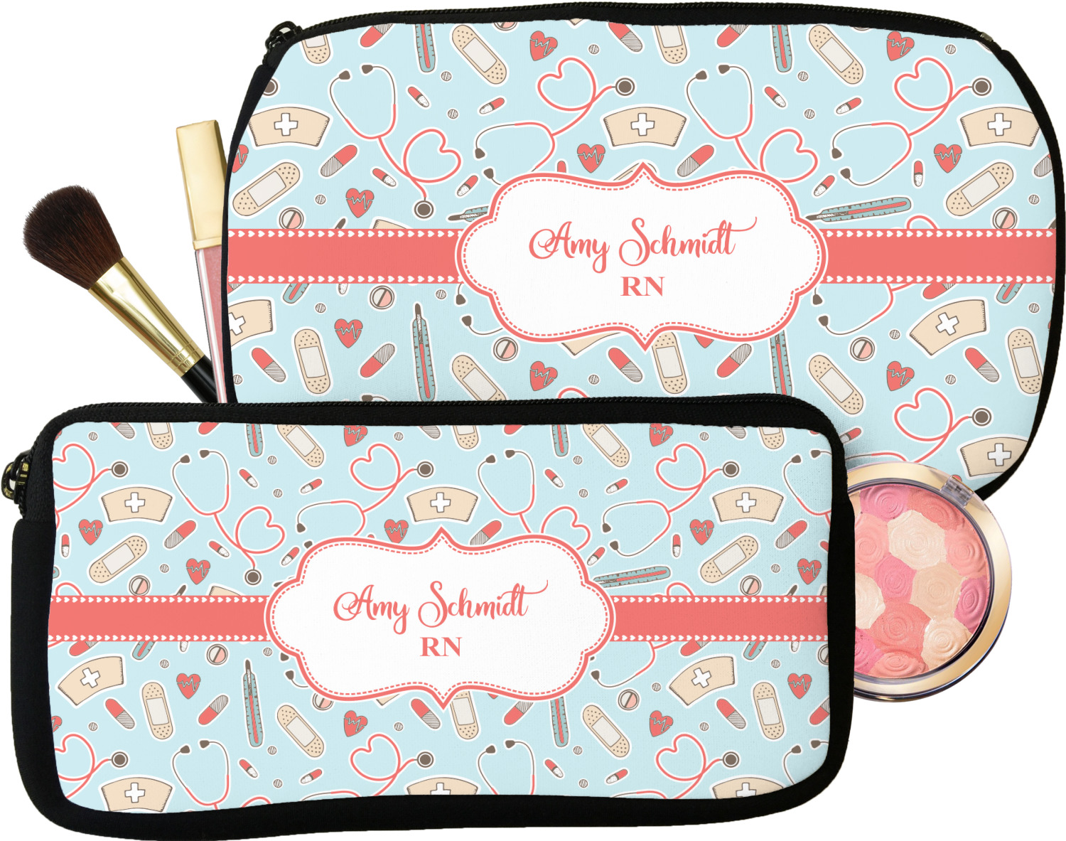 Every girl and woman carries makeup and cosmetics in her purse. Why not carry your makeup in these beautiful custom made and personalized makeup bags. These cosmetic bags also make a great bridesmaid gift.
