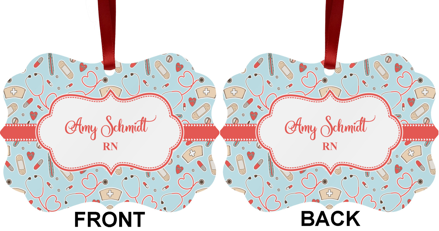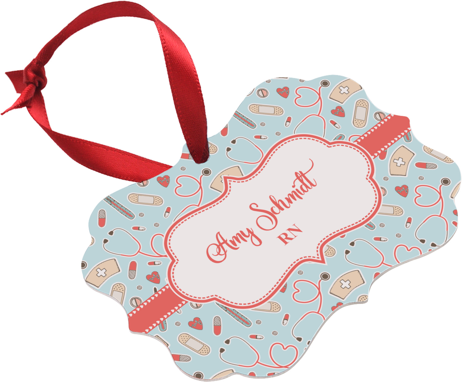 This design features a fun pattern with illustrations of different nursing tools, such as a stethescope, band aid, medicine, and more! The background is a light blue, while the ribbon is a coral color. There is a frame in the middle to put your personalization.