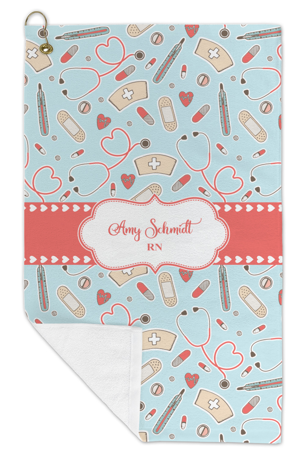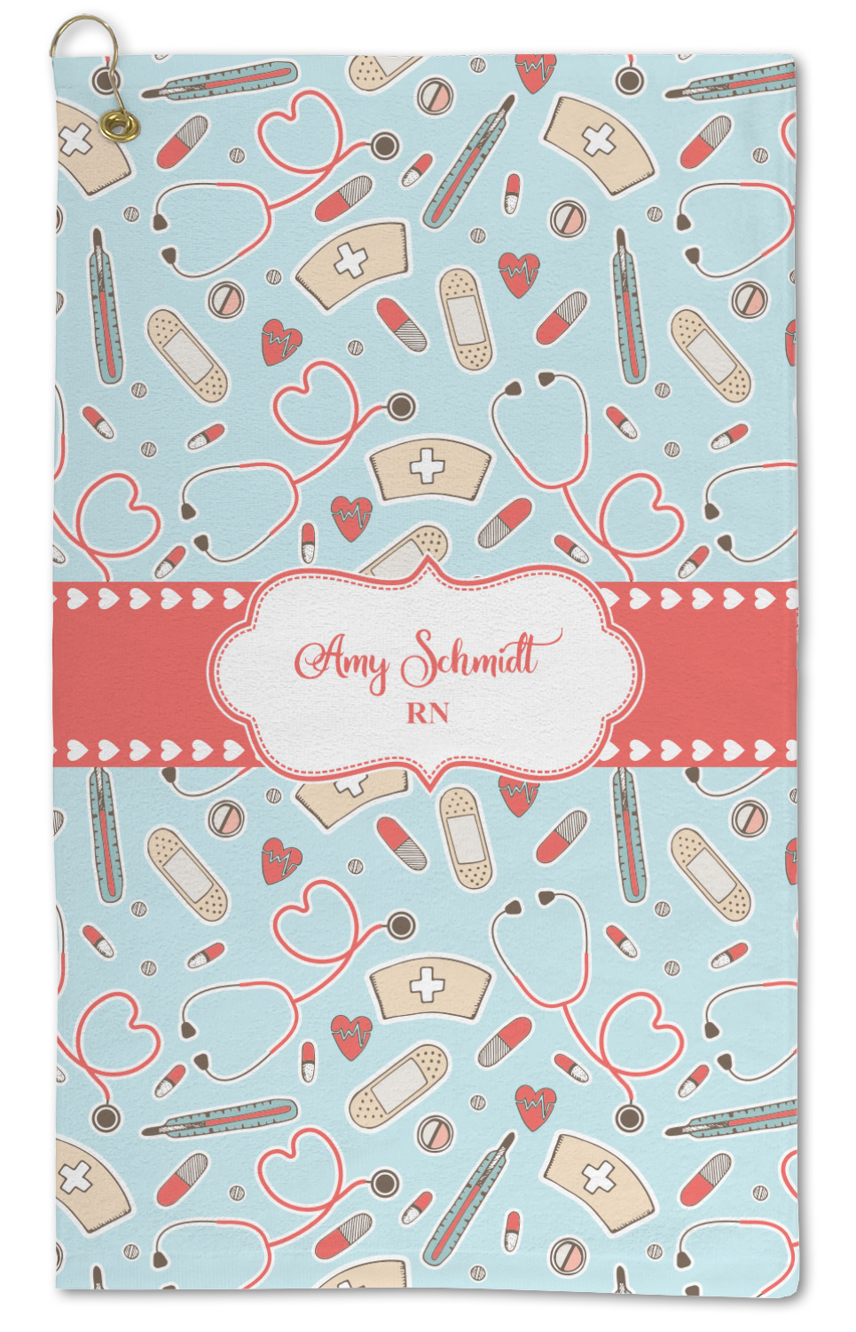 This design features a fun pattern with illustrations of different nursing tools, such as a stethescope, band aid, medicine, and more! The background is a light blue, while the ribbon is a coral color. There is a frame in the middle to put your personalization.