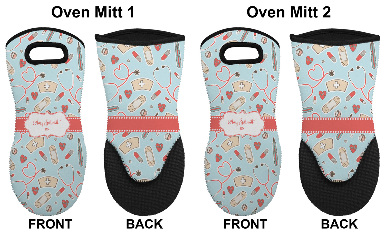 These heat resistant gloves are made entirely of a durable neoprene; the front features a softer texture, while the palm's side has a textured surface, meant to handle heat up to 500 degrees Fahrenheit. Thick, heavy duty stitching connects the two sides. A small, oval cutout appears on the front, and can be used to hang and store the mitt. Your personalization appears on the front, and the upper part of the back of the mitt. The style of these oven mitts are suitable for both the right and left hand, depending on your needs. If you need one for each hand, be sure to order two!