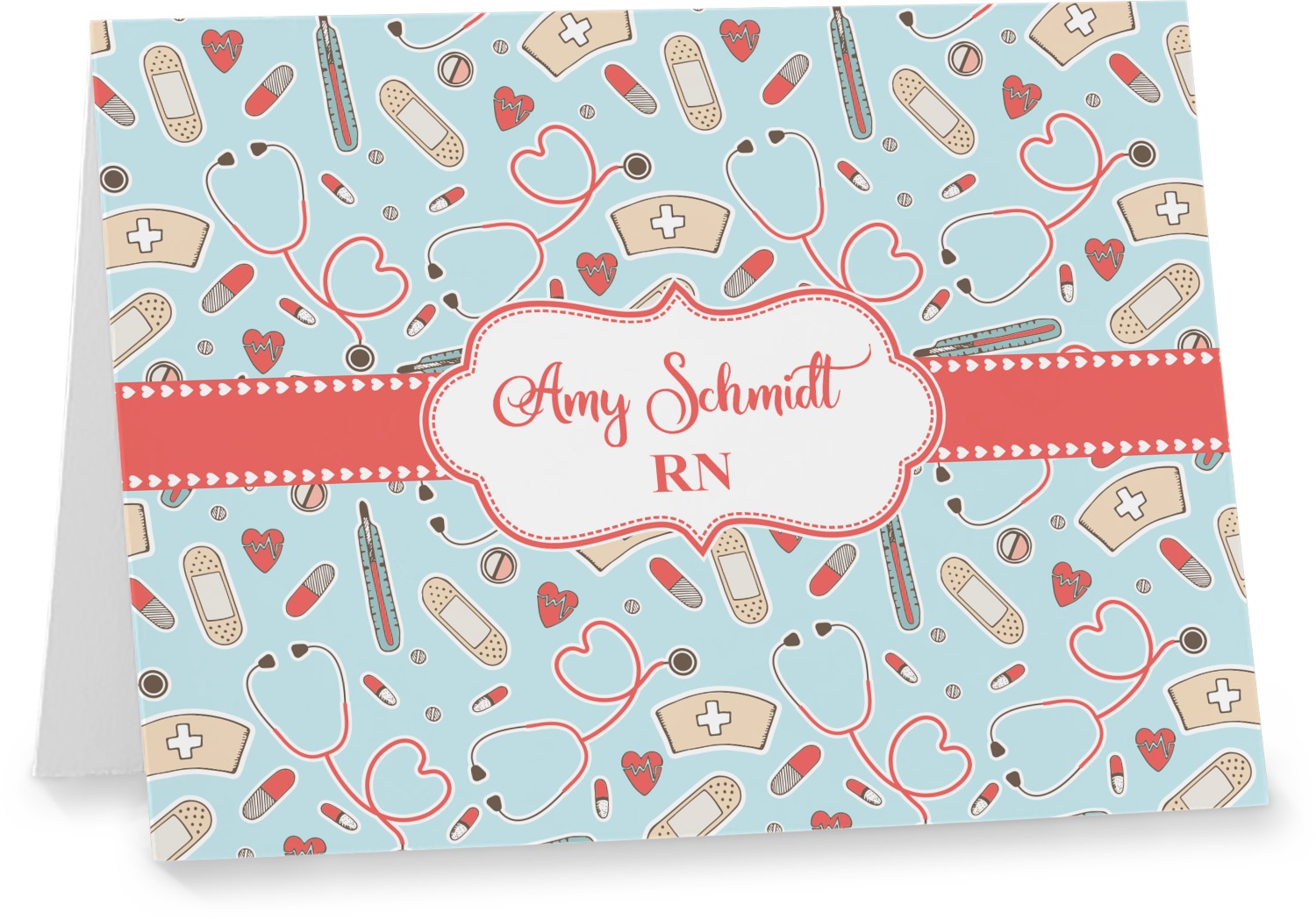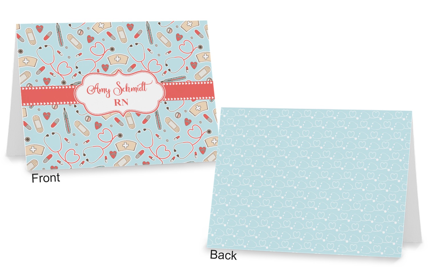 Our custom folded note cards are printed on premium 100lb. card stock and comes with white envelopes. The note card measure 5.5 by 4.25 inches and are blank on the inside for your handwritten message.