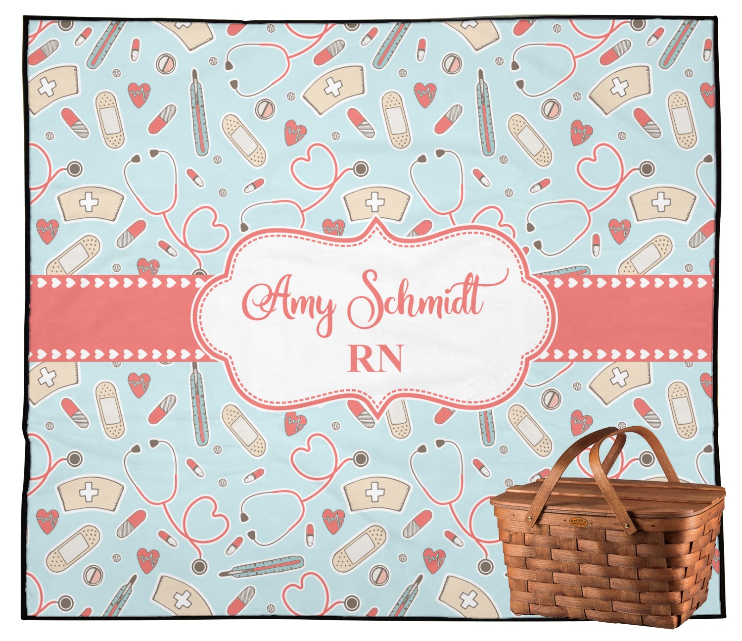 This design features a fun pattern with illustrations of different nursing tools, such as a stethescope, band aid, medicine, and more! The background is a light blue, while the ribbon is a coral color. There is a frame in the middle to put your personalization.