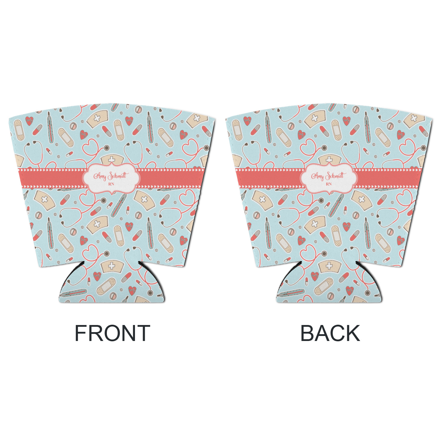 This design features a fun pattern with illustrations of different nursing tools, such as a stethescope, band aid, medicine, and more! The background is a light blue, while the ribbon is a coral color. There is a frame in the middle to put your personalization.