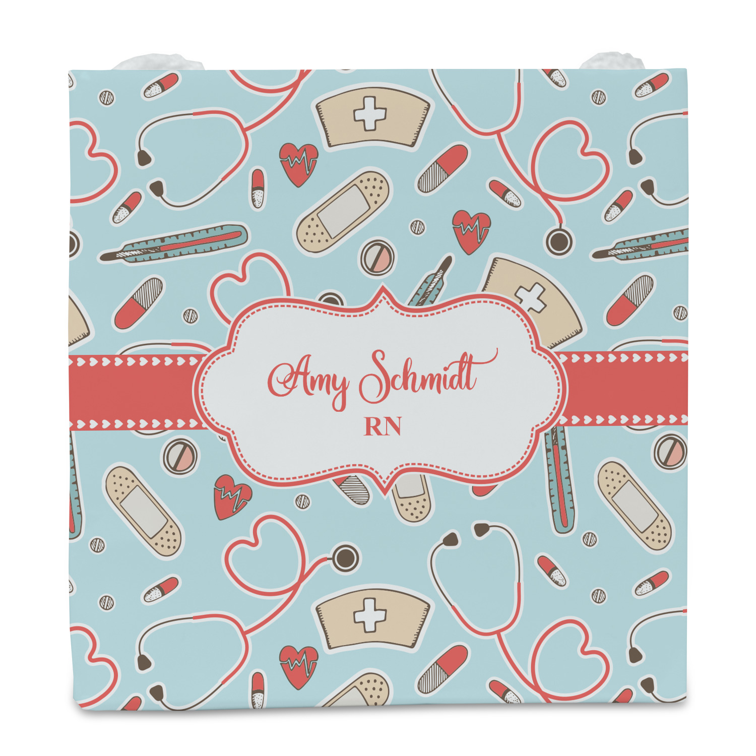 This design features a fun pattern with illustrations of different nursing tools, such as a stethescope, band aid, medicine, and more! The background is a light blue, while the ribbon is a coral color. There is a frame in the middle to put your personalization.