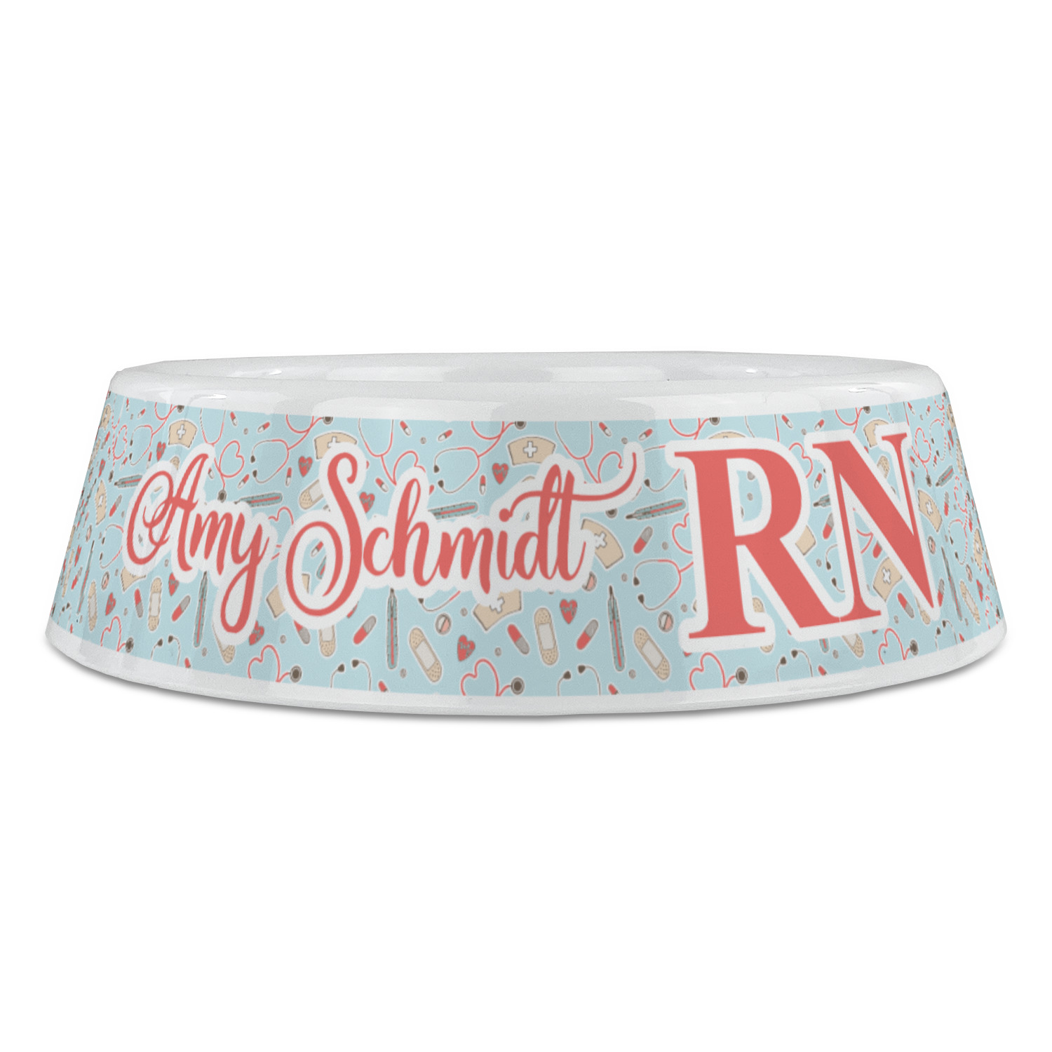 This design features a fun pattern with illustrations of different nursing tools, such as a stethescope, band aid, medicine, and more! The background is a light blue, while the ribbon is a coral color. There is a frame in the middle to put your personalization.