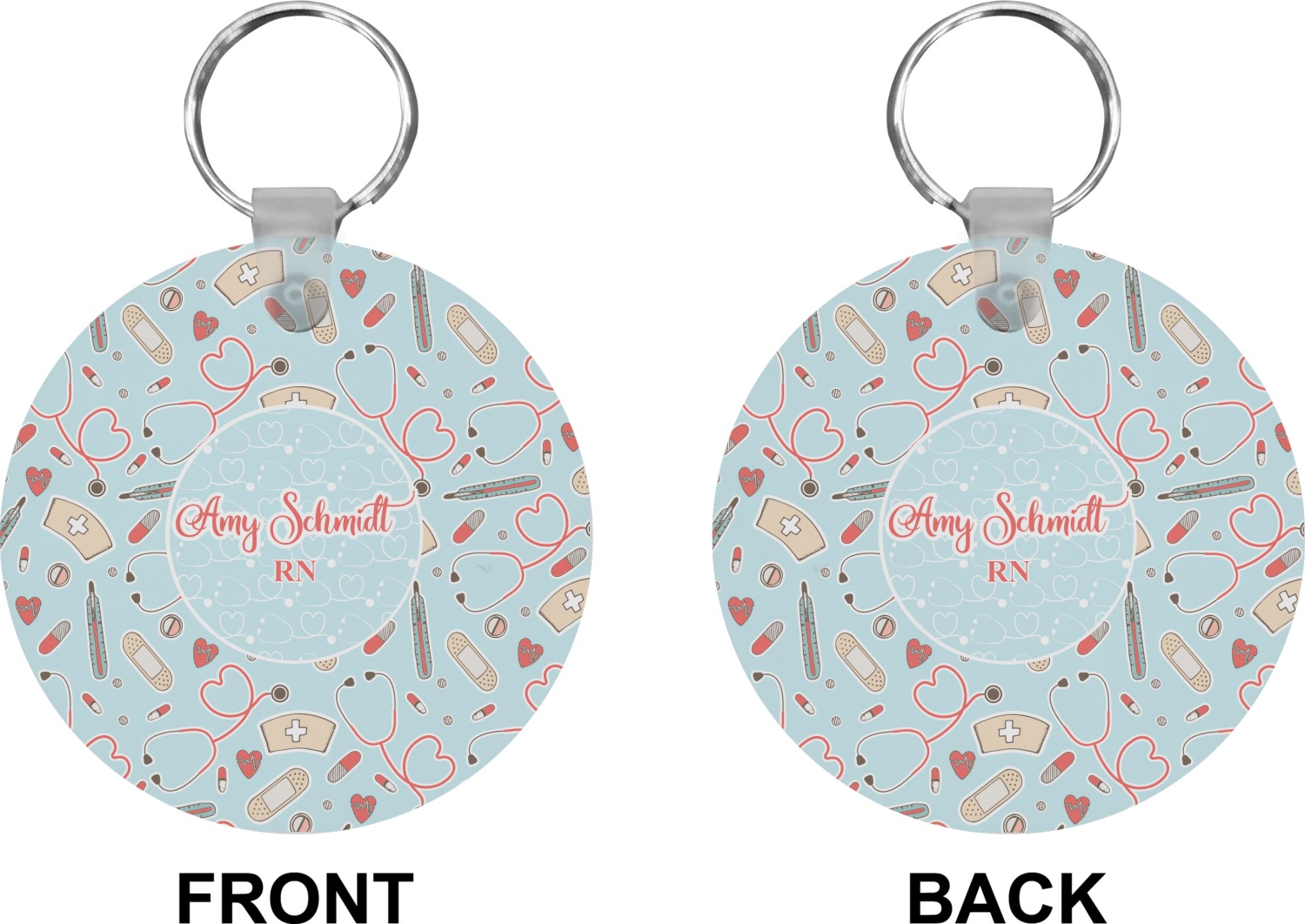 Our personalized keychains attach to the included metal, split key ring with a plastic, removable snap. Since a metal ring is included with your purchase, you have the liberty to keep your keys together on the ring, with or without your unique keychain. We offer this keychain in three different shapes: circle, heart, or diamond. We print your personalized design(s) on both sides of the key chain, and the surface has a glossy, reflective finish that only emphasizes your design. Each keychain is approximately 2.25 by 2.25 inches.